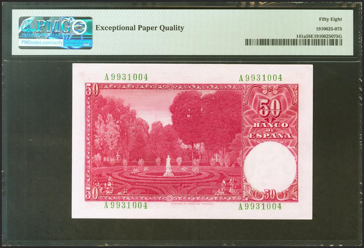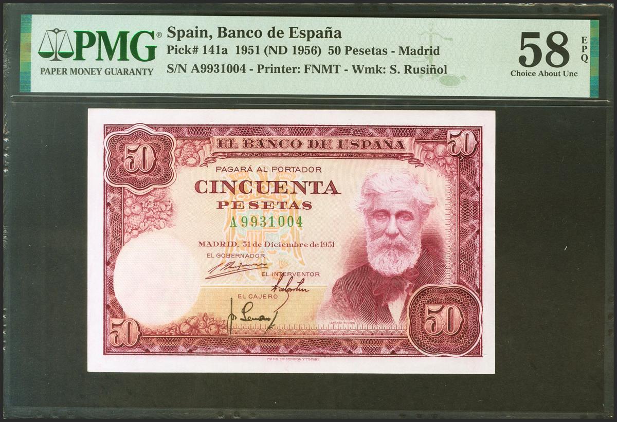 50 Pesetas. 31 de Diciembre de 1951. Serie A. (Edifil 2021: 462a, Pick: 141a). Apresto original. EBC+++. Encapsulado PMG58EPQ.