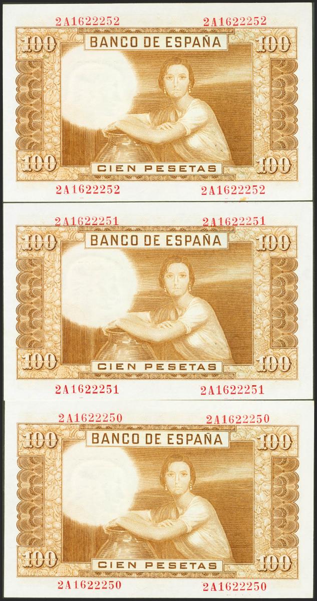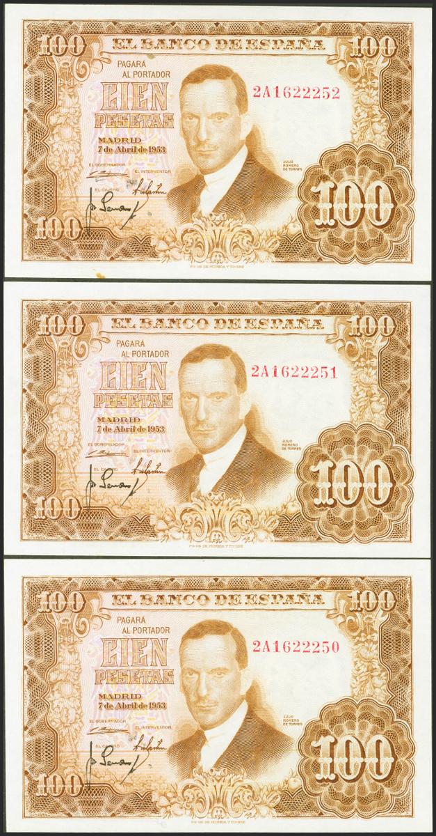 100 Pesetas. 7 de Abril de 1953. Trío correlativo. Serie 2A. (Edifil 2017: 464c). Apresto original y uno de ellos con manchita de óxido. SC.