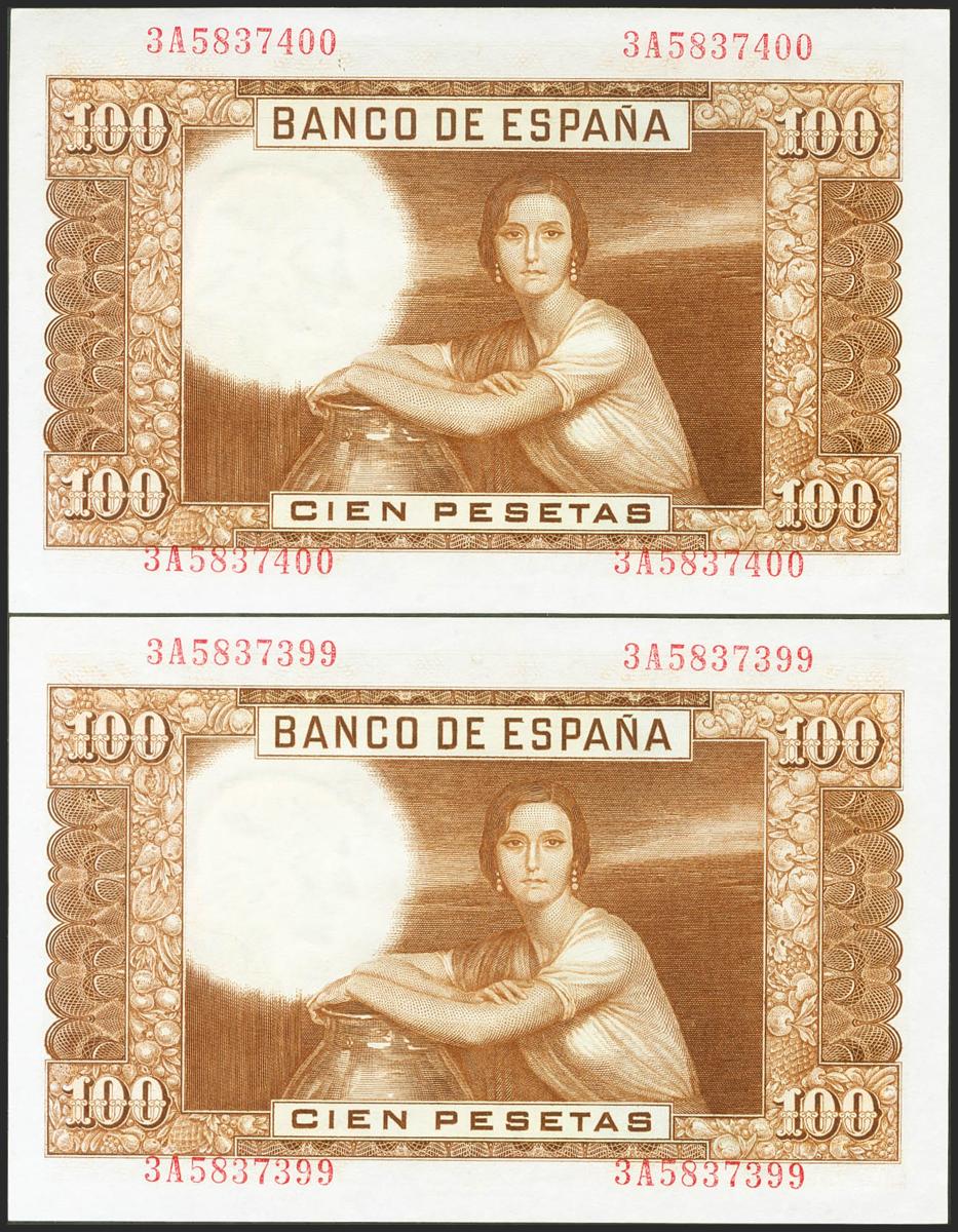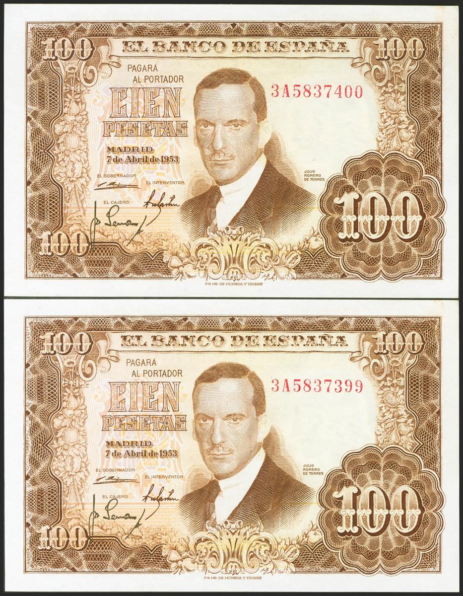 100 Pesetas. 7 de Abril de 1953. Pareja correlativa. Serie 3A. (Edifil 2021: 464c). Apresto original. SC.