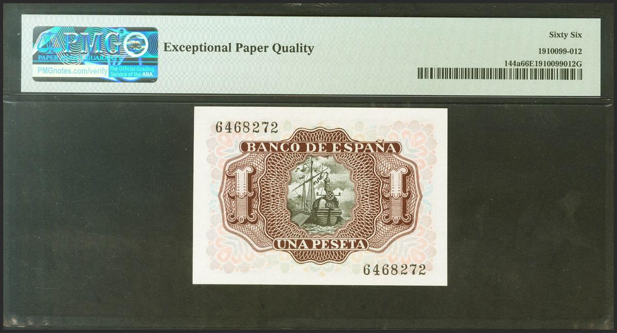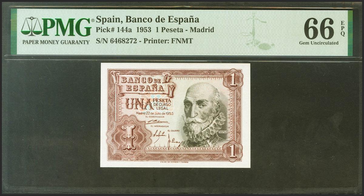 1 Peseta. 22 de Julio de 1953. Sin serie. (Edifil 2021: 465, Pick: 144a). Inusual en esta excepcional calidad, apresto original. SC. Encapsulado PMG66EPQ.