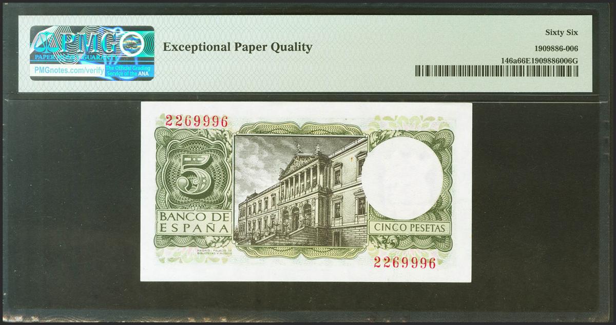5 Pesetas. 22 de Julio de 1954. Sin serie. (Edifil 2021: 466, Pick: 146a). Raro en esta excepcional calidad, apresto original. SC. Encapsulado PMG66EPQ.
