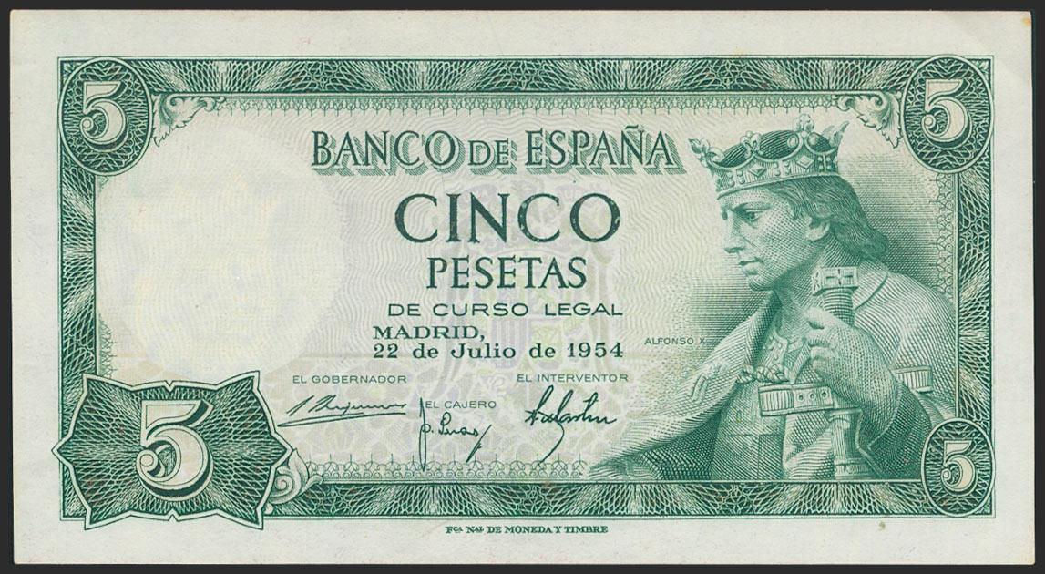 5 Pesetas. 22 de Julio de 1954. Sin serie. (Edifil 2021: 466). Apresto original. EBC++.