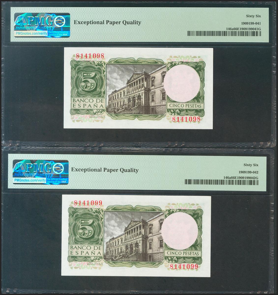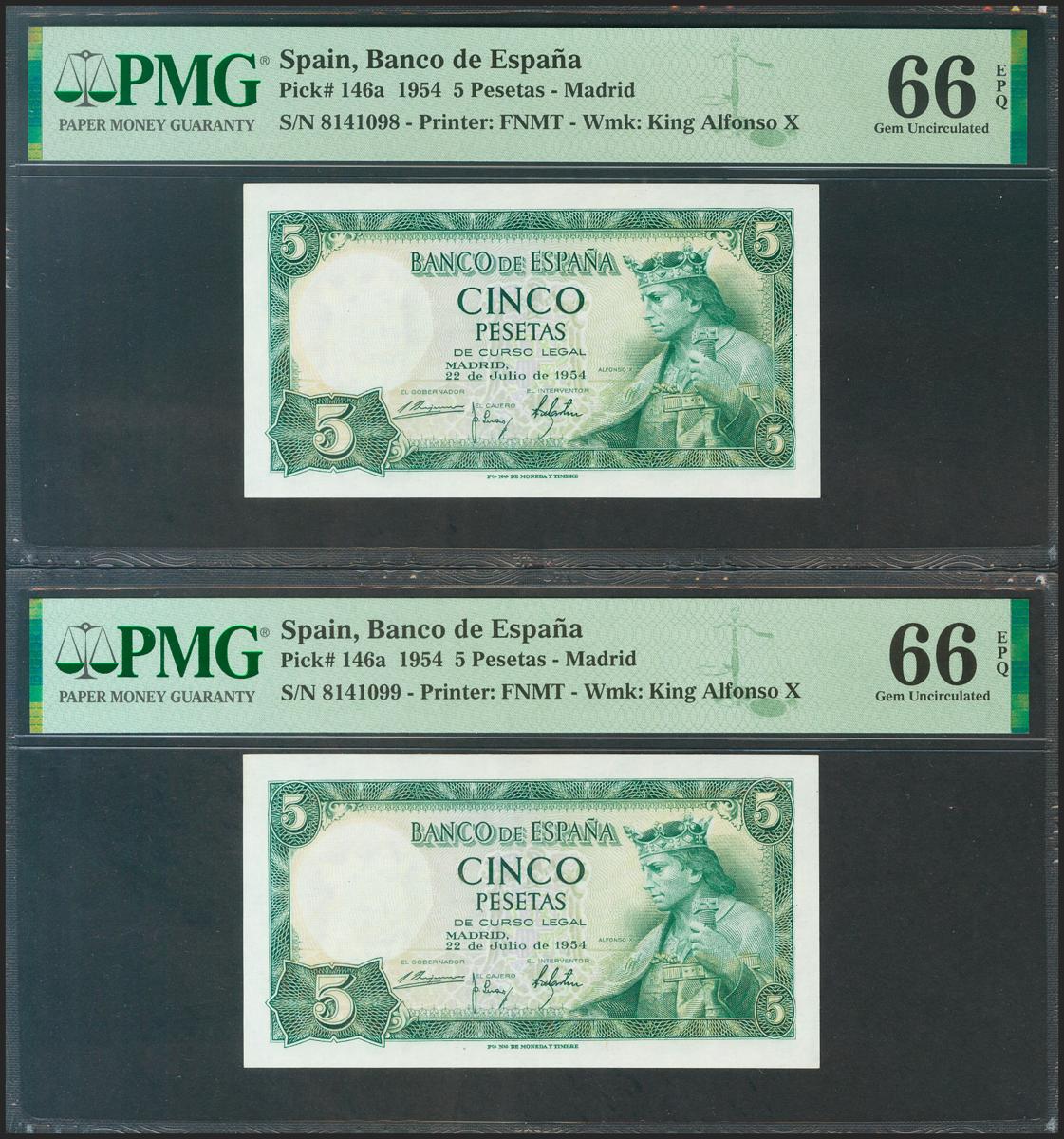 5 Pesetas. 22 de Julio de 1954. Pareja correlativa. Sin serie. (Edifil 2021: 466, Pick: 146a). Rara en esta calidad, apresto original. SC. Encapsulado PMG66EPQ, ambos.