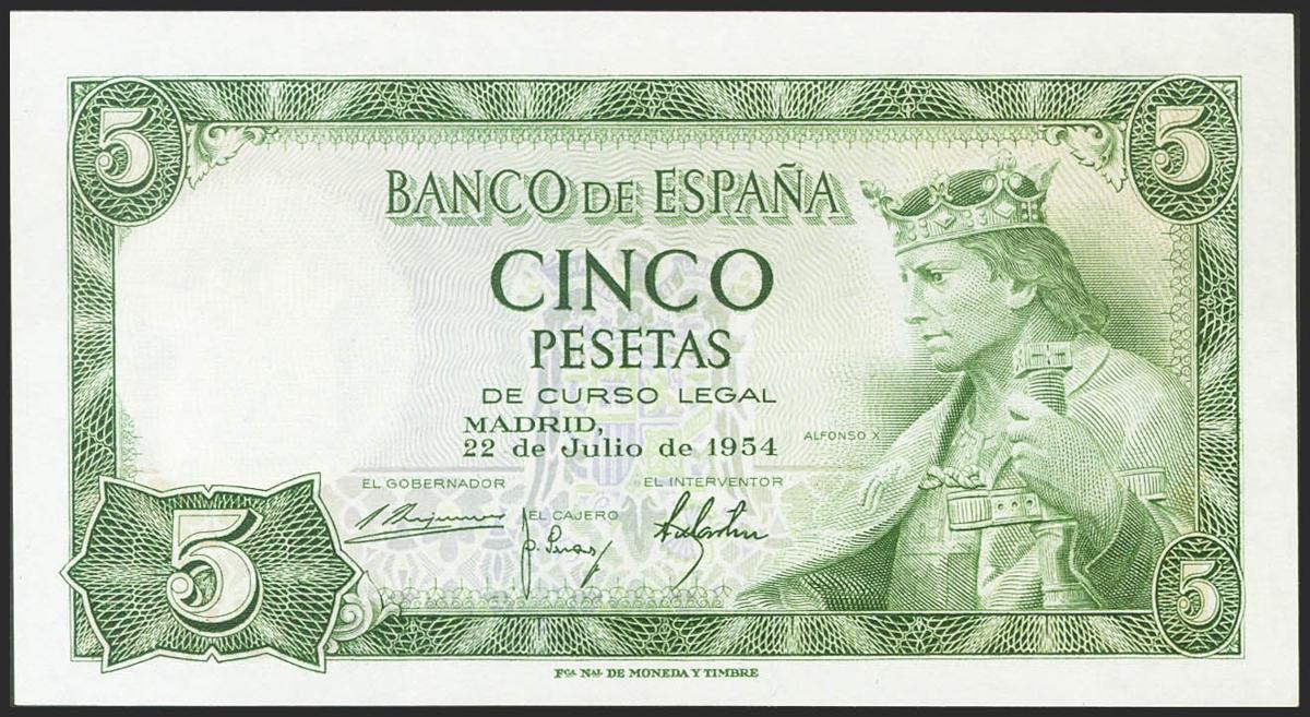5 Pesetas. 22 de Julio de 1954. Serie V. (Edifil 2021: 466a). Conserva todo su apresto original. SC.