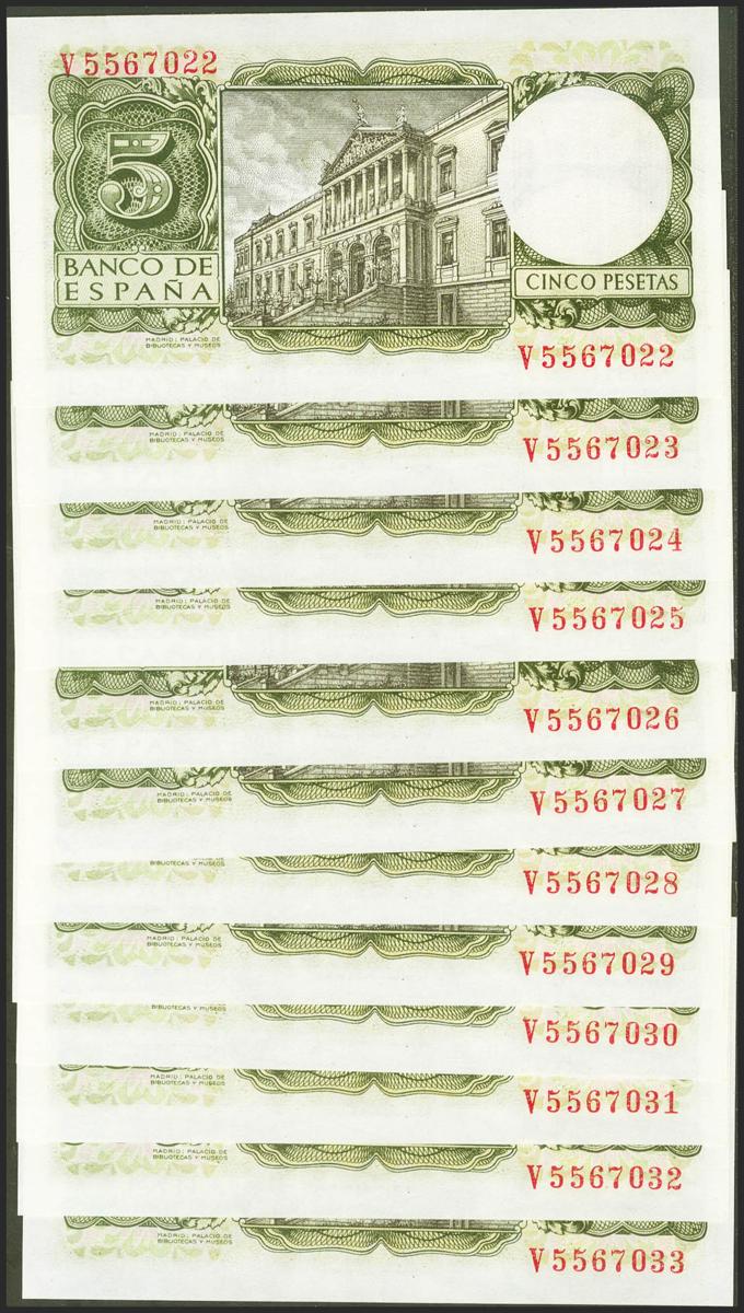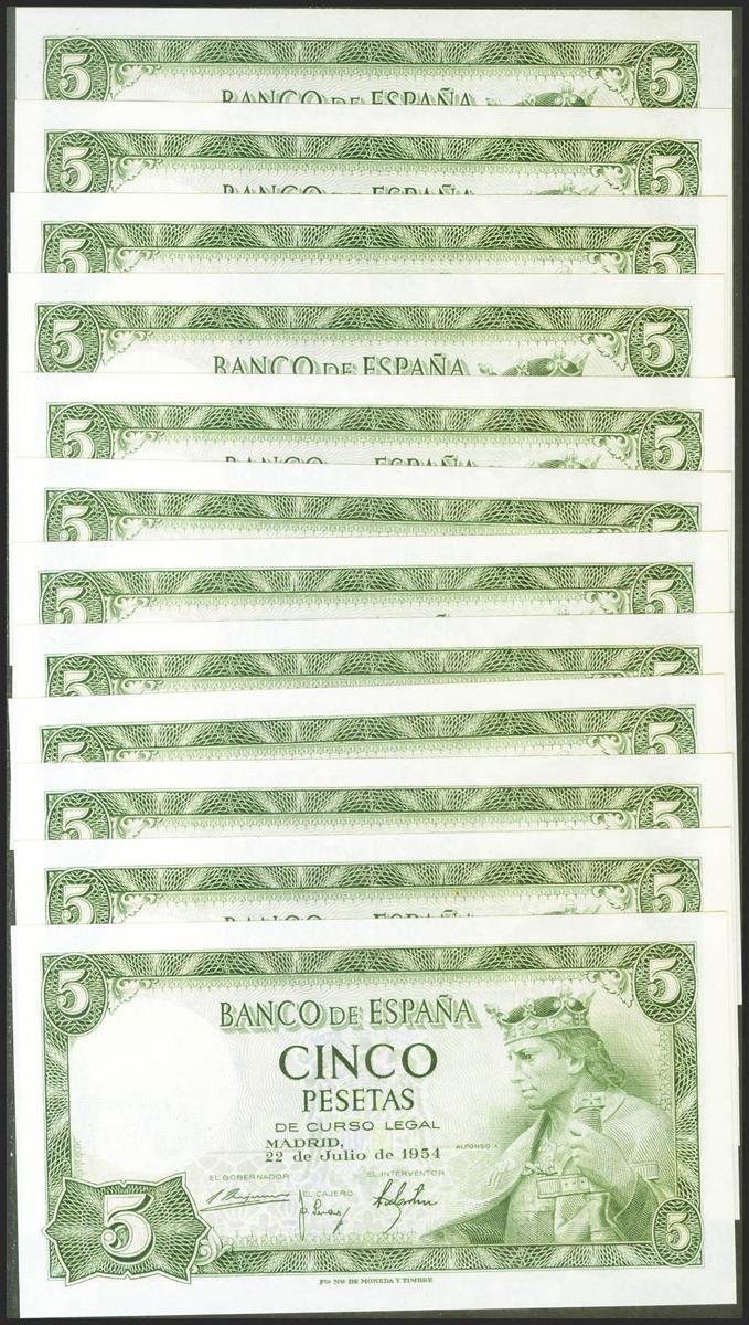 Conjunto de 12 billetes correlativos de 5 Pesetas, emitidos el 22 de Julio de 1954, todos ellos con la serie V (Edifil 2021: 466a), conservando todo su apresto original. SC/SC-.
