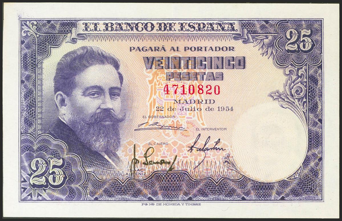 25 Pesetas. 22 de Julio de 1954. Sin serie. (Edifil 2021: 467). Conserva gran parte del apresto original. EBC.