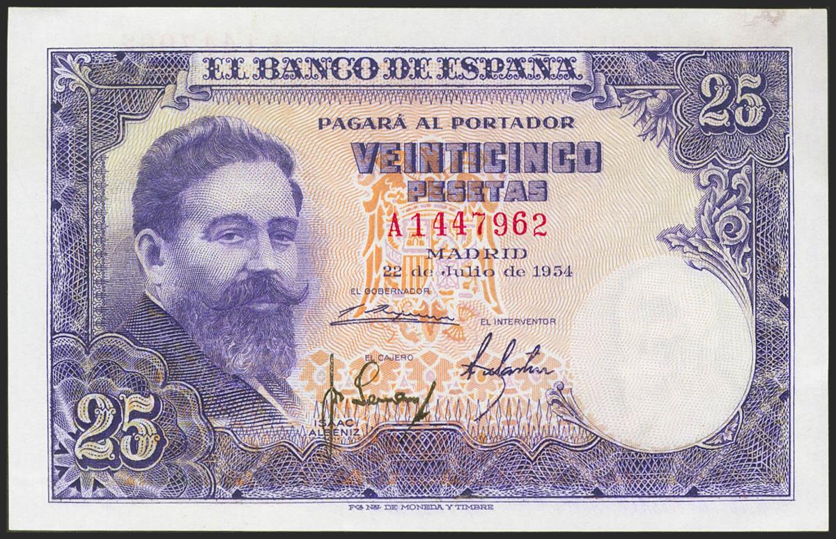 25 Pesetas. 22 de Julio de 1954. Serie A. (Edifil 2021: 467a). Conserva todo su apresto original. SC.