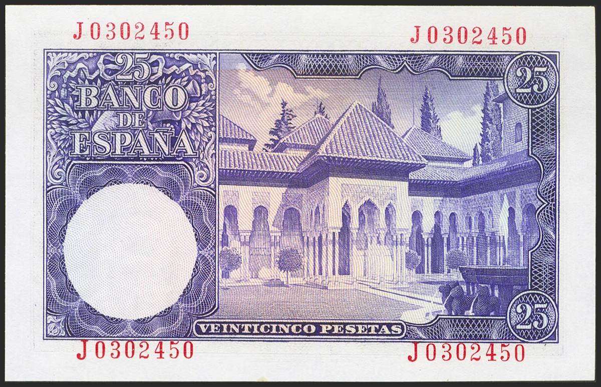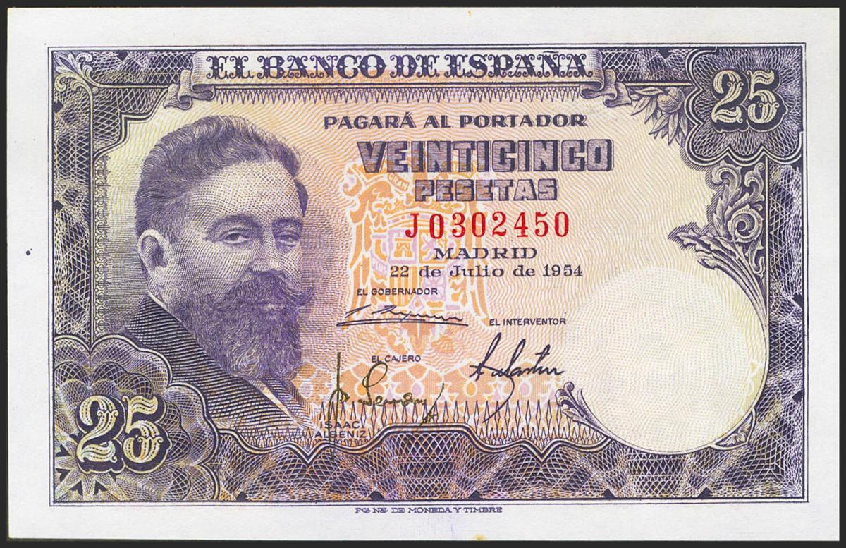 25 Pesetas. 22 de Julio de 1954. Serie J. (Edifil 2021: 467a). Conserva todo su apresto original. SC.