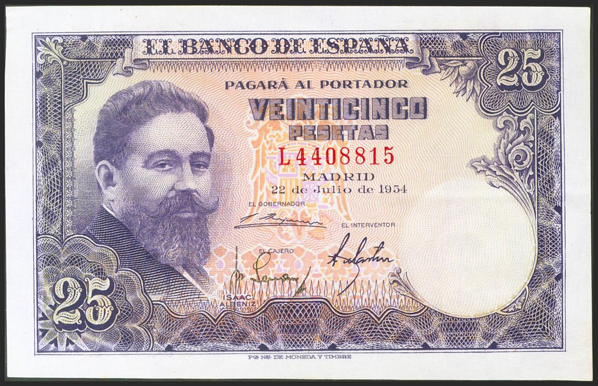 25 Pesetas. 22 de Julio de 1954. Serie L. (Edifil 2021: 467a). Conserva todo su apresto original. EBC++.
