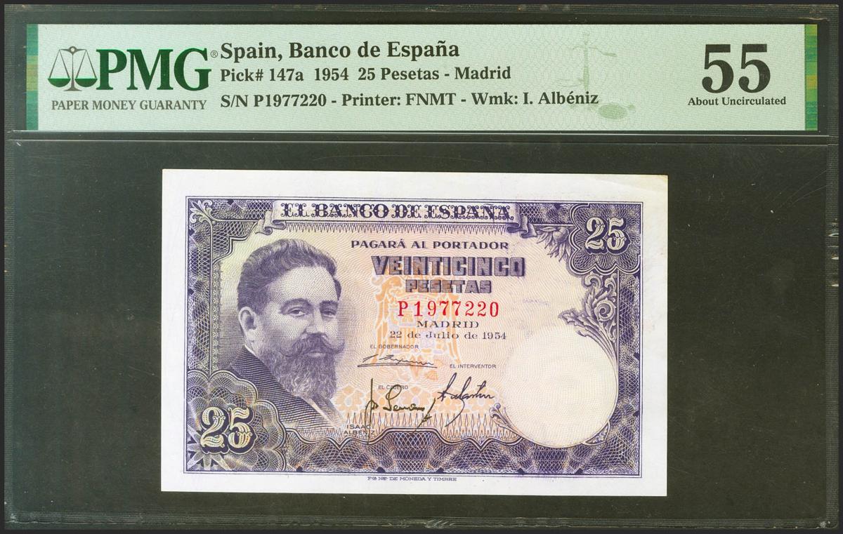 25 Pesetas. 22 de Julio de 1953. Serie P. (Edifil 2021: 467b, Pick: 147a). Muy rara serie. EBC+. Encapsulado PMG55.