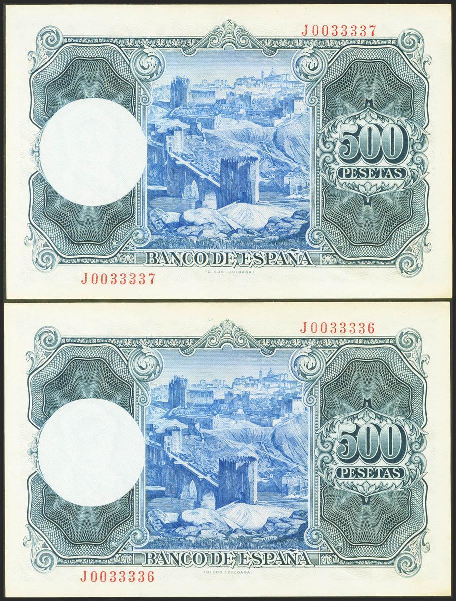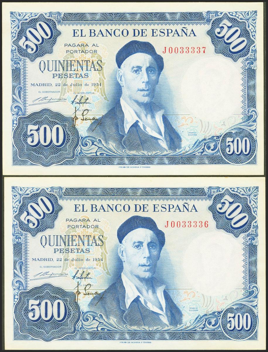 500 Pesetas. 22 de Julio de 1954. Pareja correlativa. Serie J. (Edifil 2021: 468b). Conserva todo su apresto original. SC-.