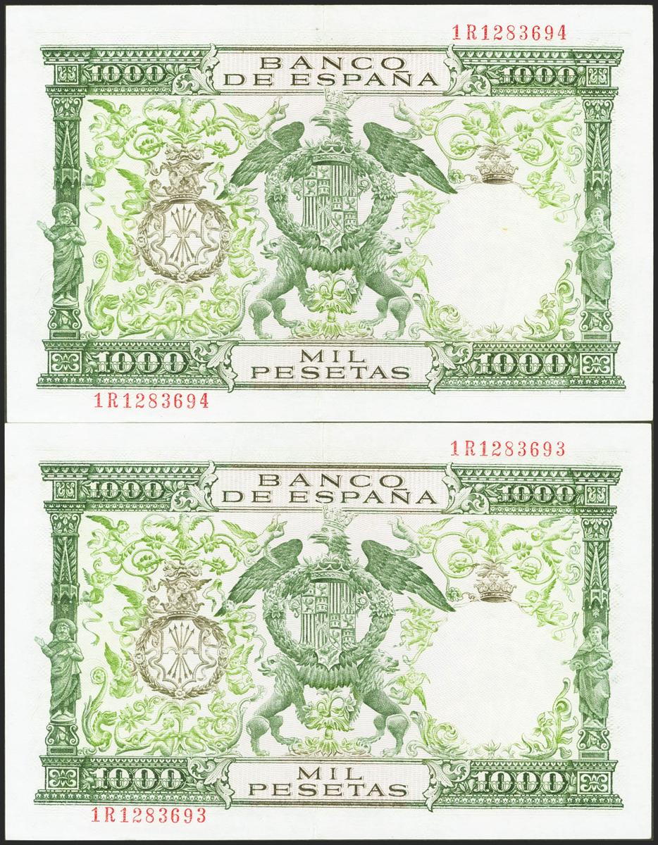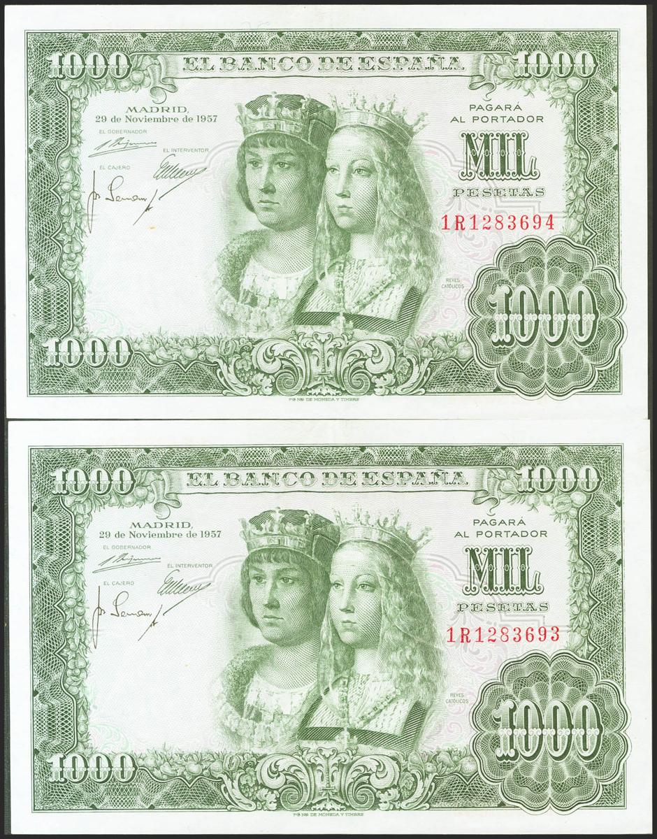 1000 Pesetas. 29 de Noviembre de 1957. Pareja correlativa. Serie 1R. (Edifil 2021: 469b). Apresto original. EBC+.