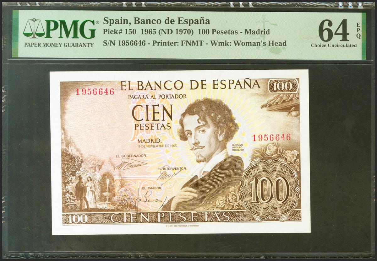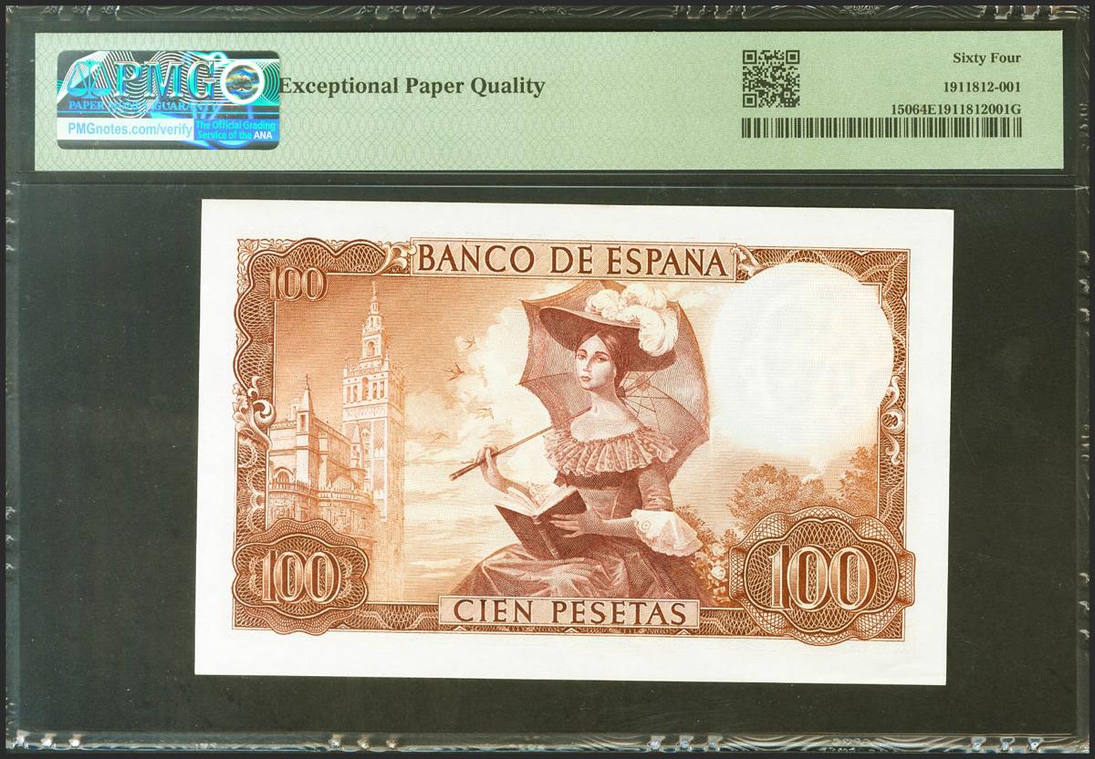 100 Pesetas. 19 de Noviembre de 1965. Sin serie. (Edifil 2021: 470, Pick: 150). Apresto original. Encapsulado PMG64EPQ.