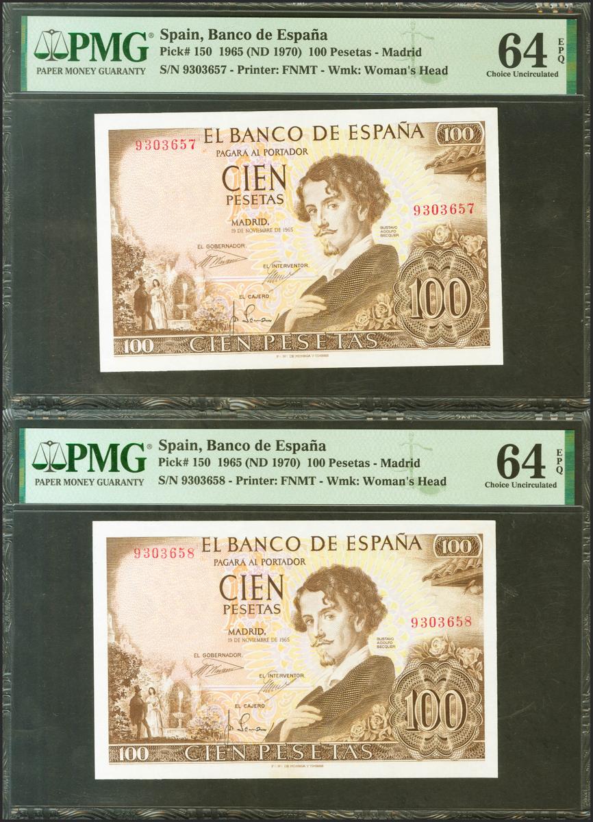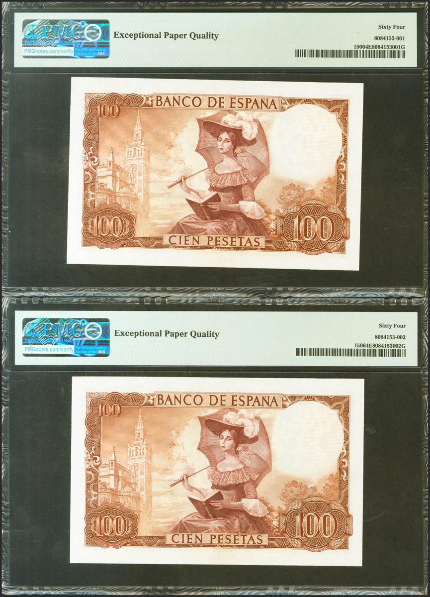 100 Pesetas. 19 de Noviembre de 1965. Pareja correlativa. Sin serie. (Edifil 2021: 470, Pick: 150). Apresto original. Encapsulados PMG64EPQ, ambos.