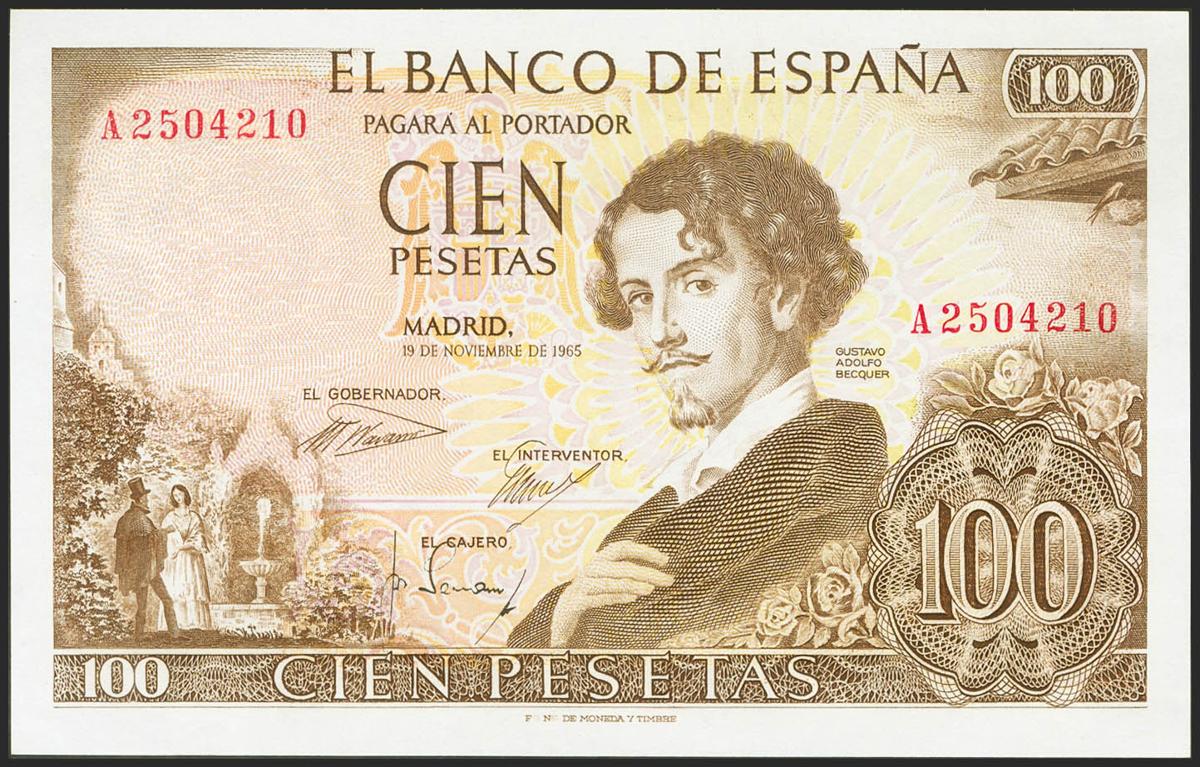 100 Pesetas. 19 de Noviembre de 1965. Serie A. (Edifil 2021: 470a). Conserva todo su apresto original. SC.