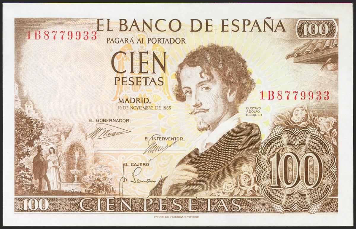 100 Pesetas. 19 de Noviembre de 1965. Serie 1B. (Edifil 2021: 470a). Apresto original. SC-.