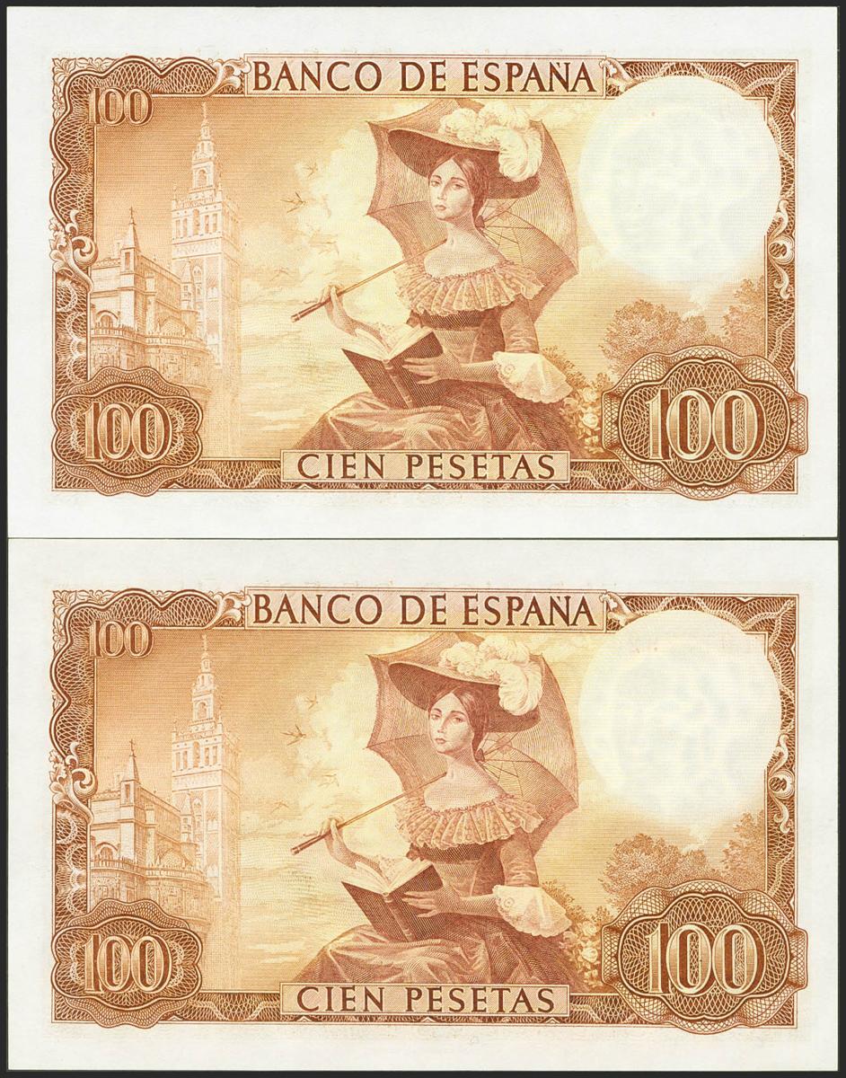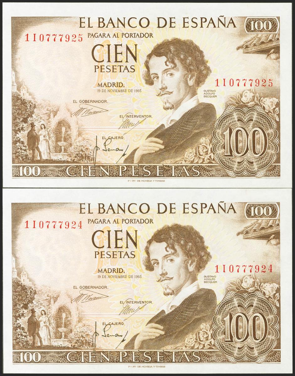 100 Pesetas. 19 de Noviembre de 1965. Pareja correlativa. Serie 1I. (Edifil 2021: 470a). Conserva todo su apresto original. SC.