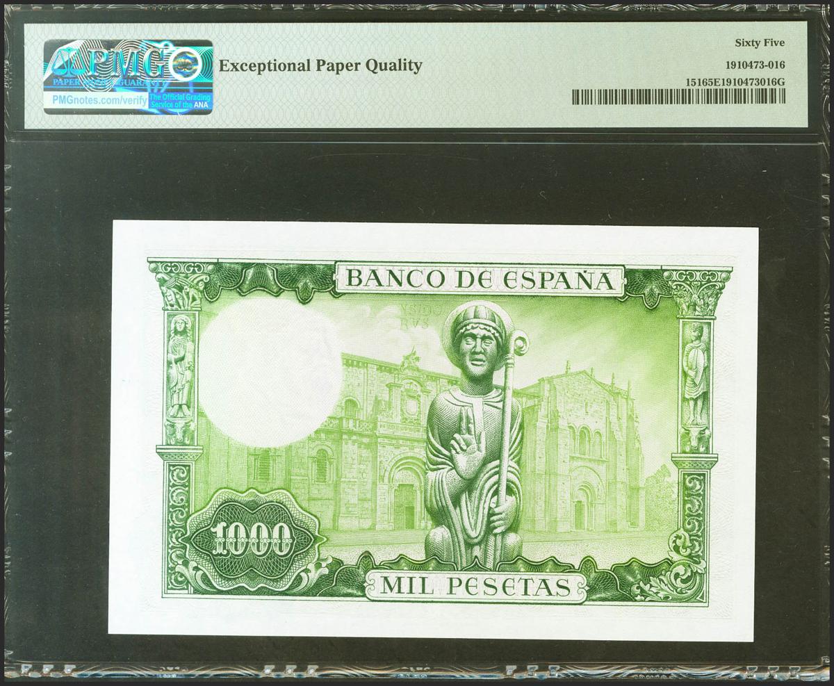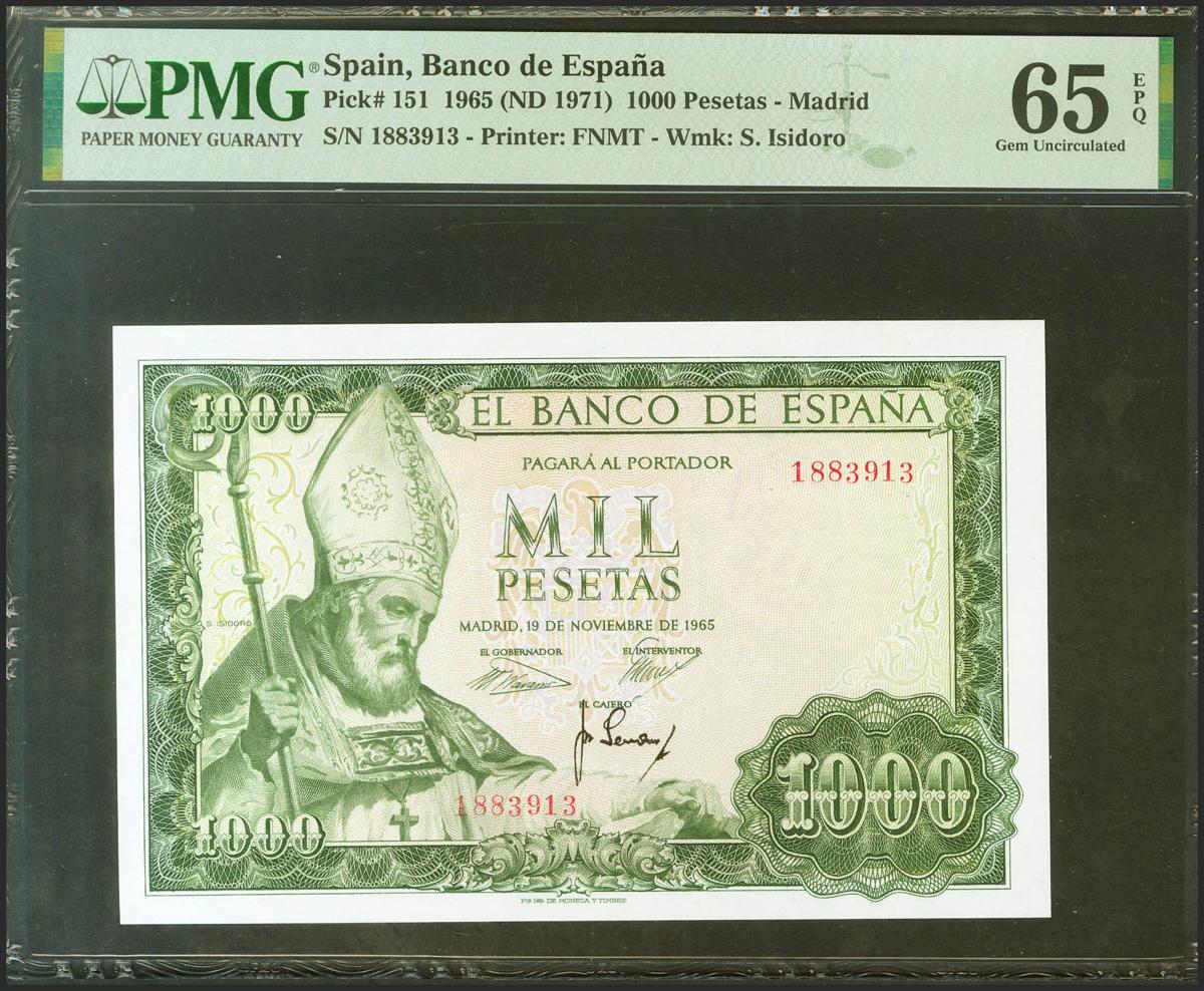 1000 Pesetas. 19 de Noviembre de 1965. Sin serie. (Edifil 2021: 471, Pick: 151). Inusual en esta excepcional calidad, apresto original. SC. Encapsulado PMG65EPQ.