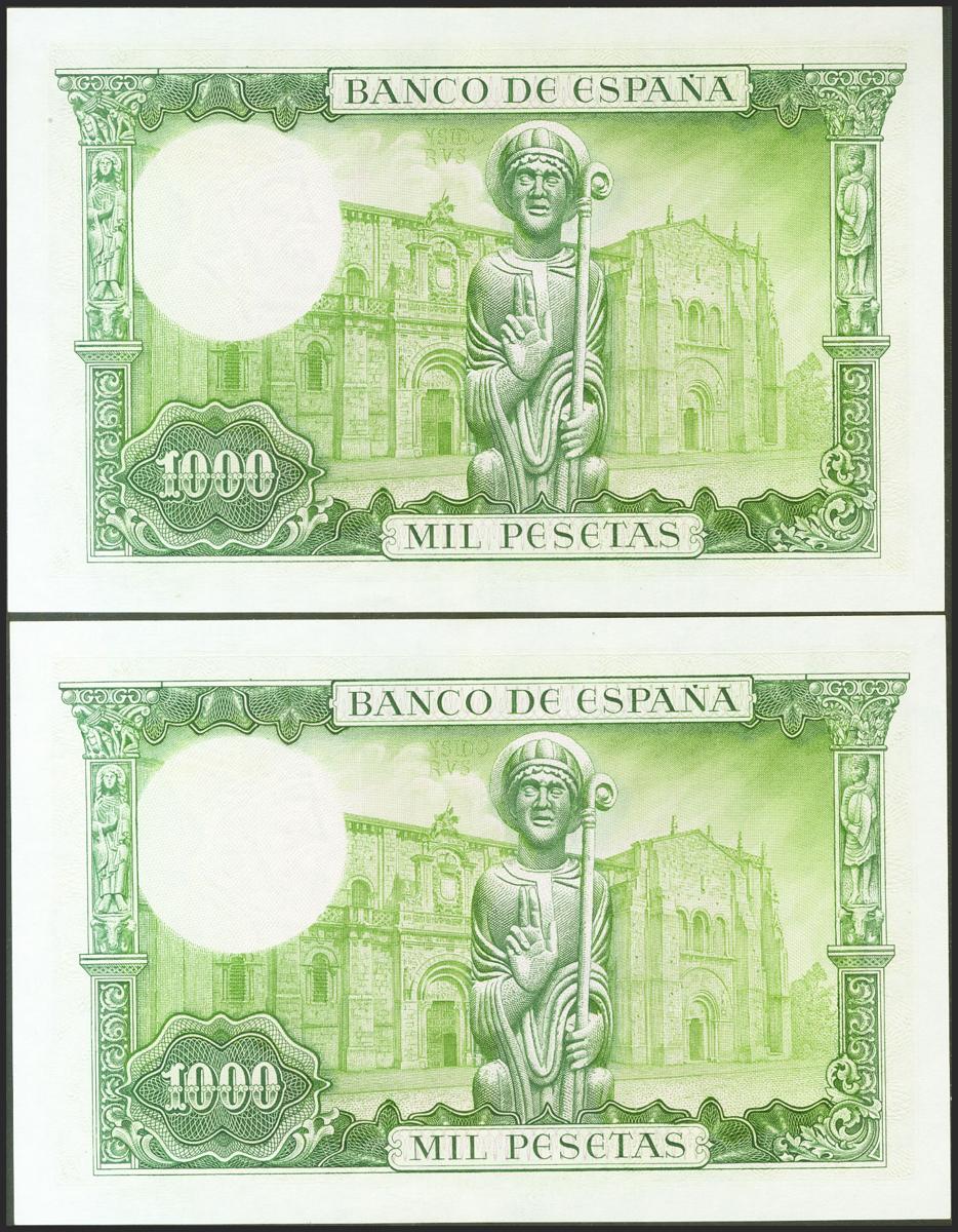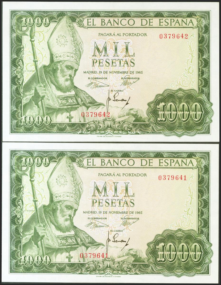 1000 Pesetas. 19 de Noviembre de 1965. Pareja correlativa. Sin serie. (Edifil 2021: 471). Conserva gran parte del apresto original. EBC.