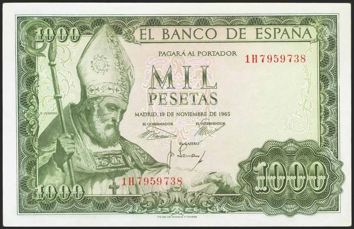 1000 Pesetas. 19 de Noviembre de 1965. Serie 1H. (Edifil 2017: 471b). Apresto original. SC-.