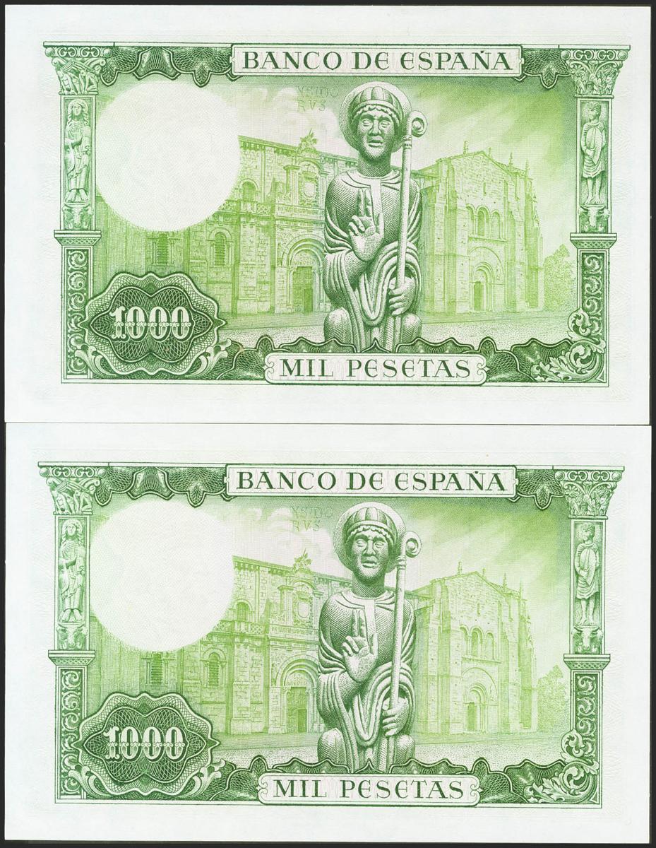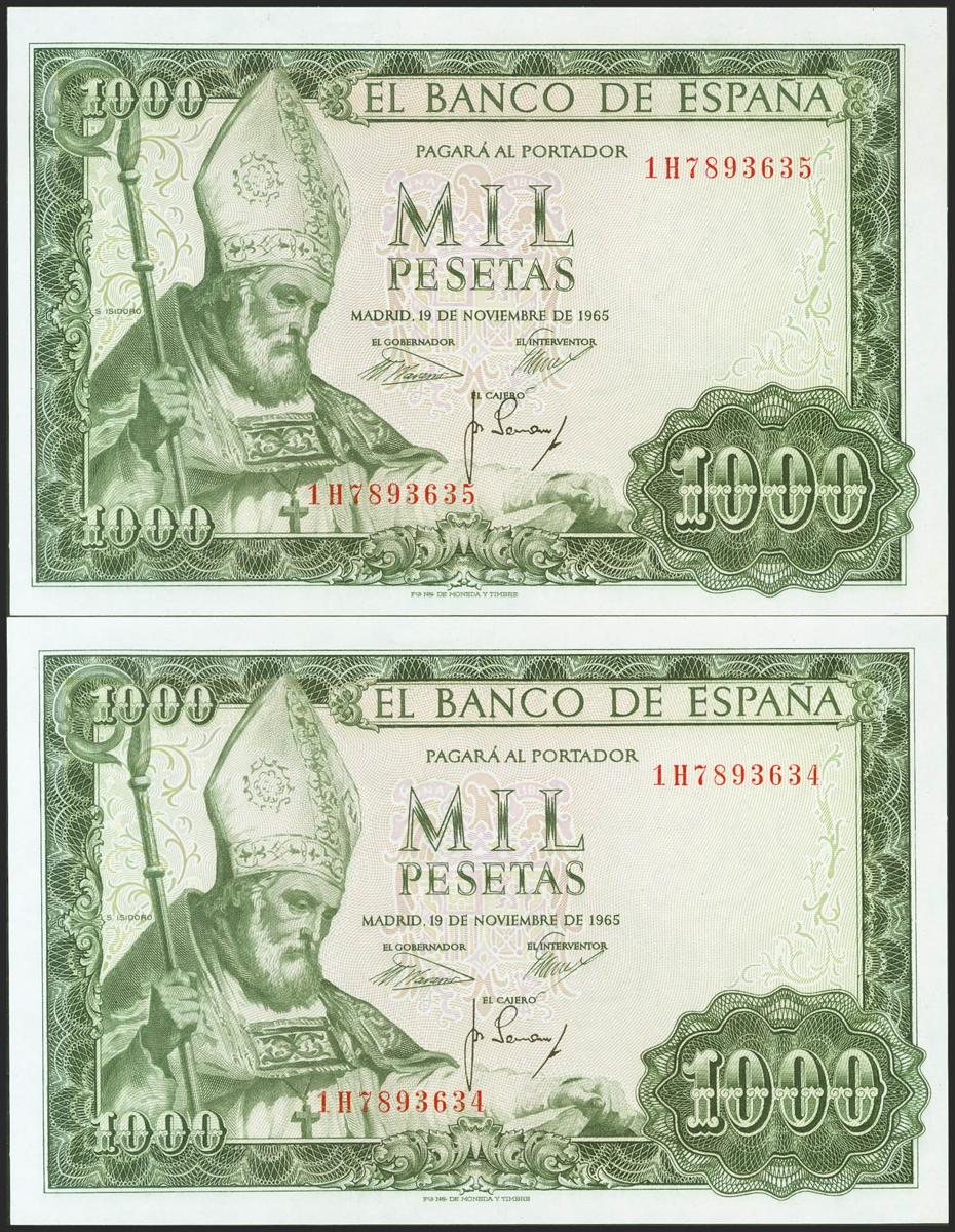 1000 Pesetas. 19 de Noviembre de 1965. Pareja correlativa. Serie 1H. (Edifil 2021: 471b). Conserva todo su apresto original. SC.