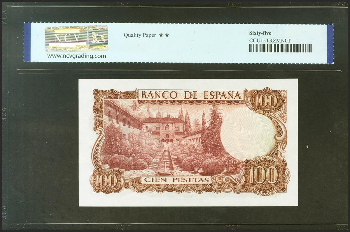 100 Pesetas. 17 de Noviembre de 1970. Serie especial 9A. (Edifil 2021: 472d, Pick: 152a*). Inusual en esta calidad, apresto original. SC. Encapsulado NCV65.