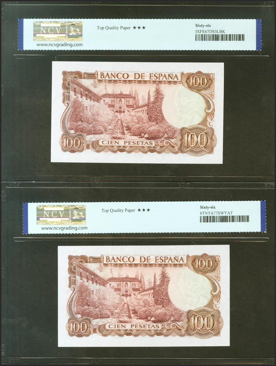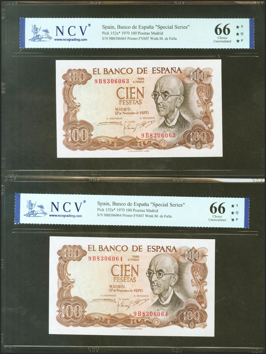 100 Pesetas. 17 de Noviembre de 1970. Pareja correlativa. Serie especial 9B. (Edifil 2021: 472d, Pick: 152a*). Rara en esta excepcional calidad, apresto original. SC. Encapsulados NCV66TQP, ambos.