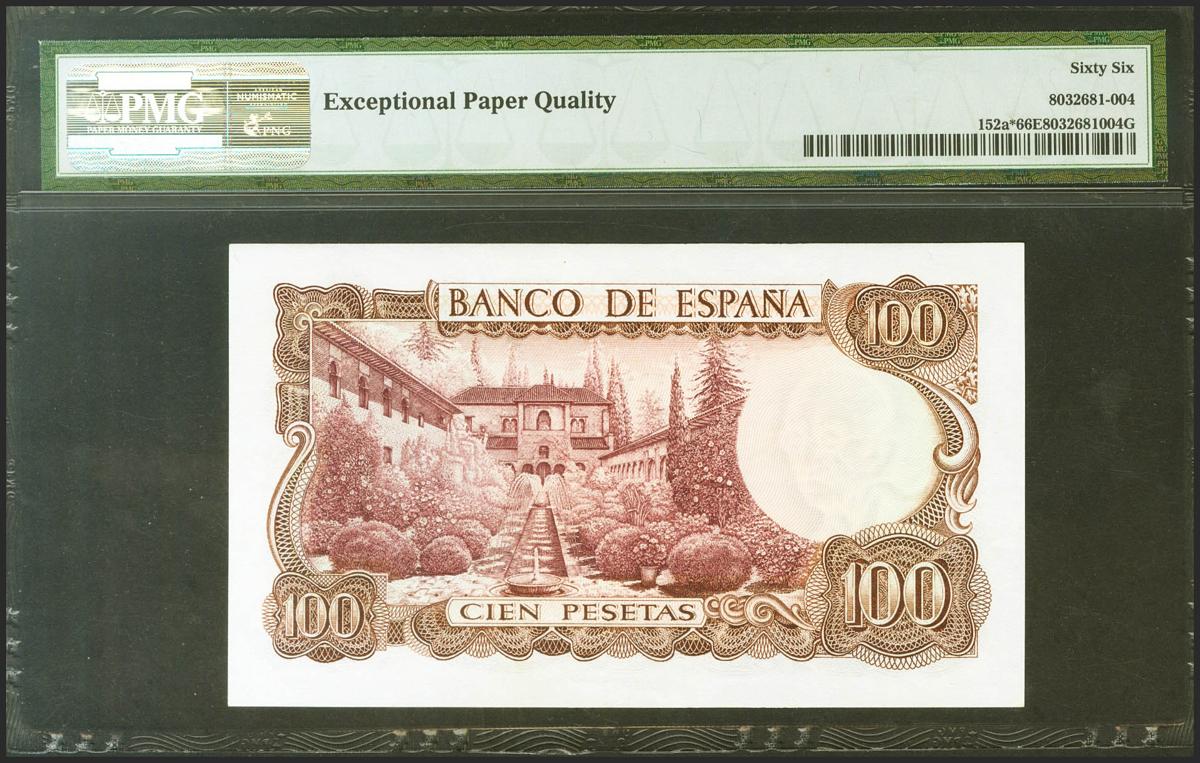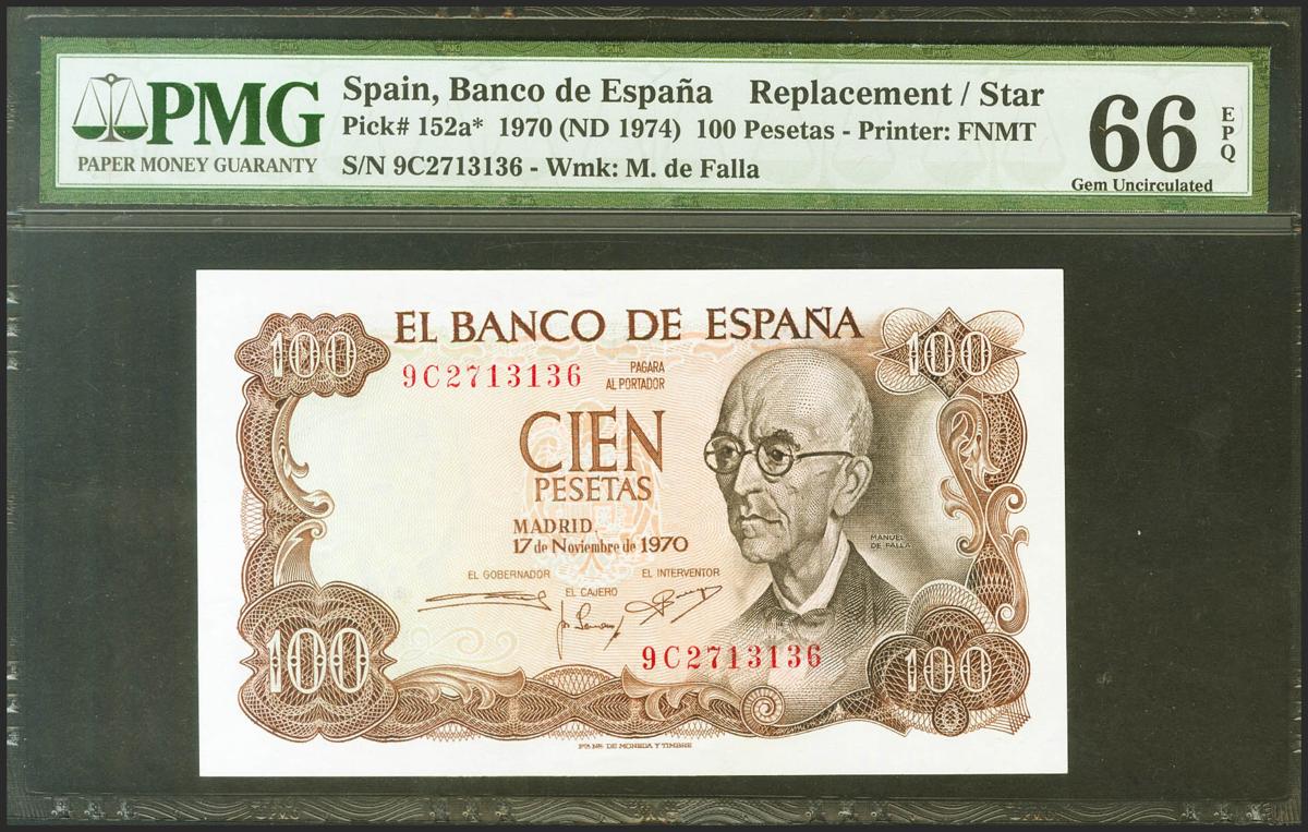 100 Pesetas. 17 de Noviembre de 1970. Serie especial 9C. (Edifil 2021: 472d, Pick: 152a*). Apresto original. SC. Encapsulado PMG66EPQ.