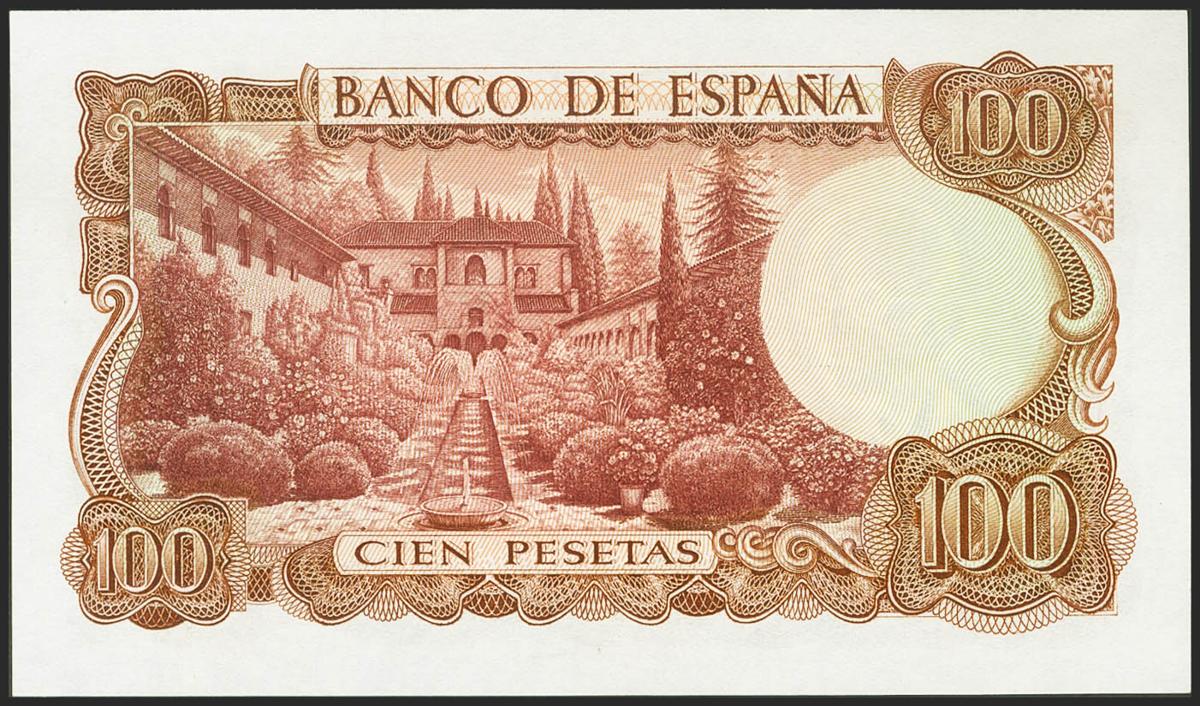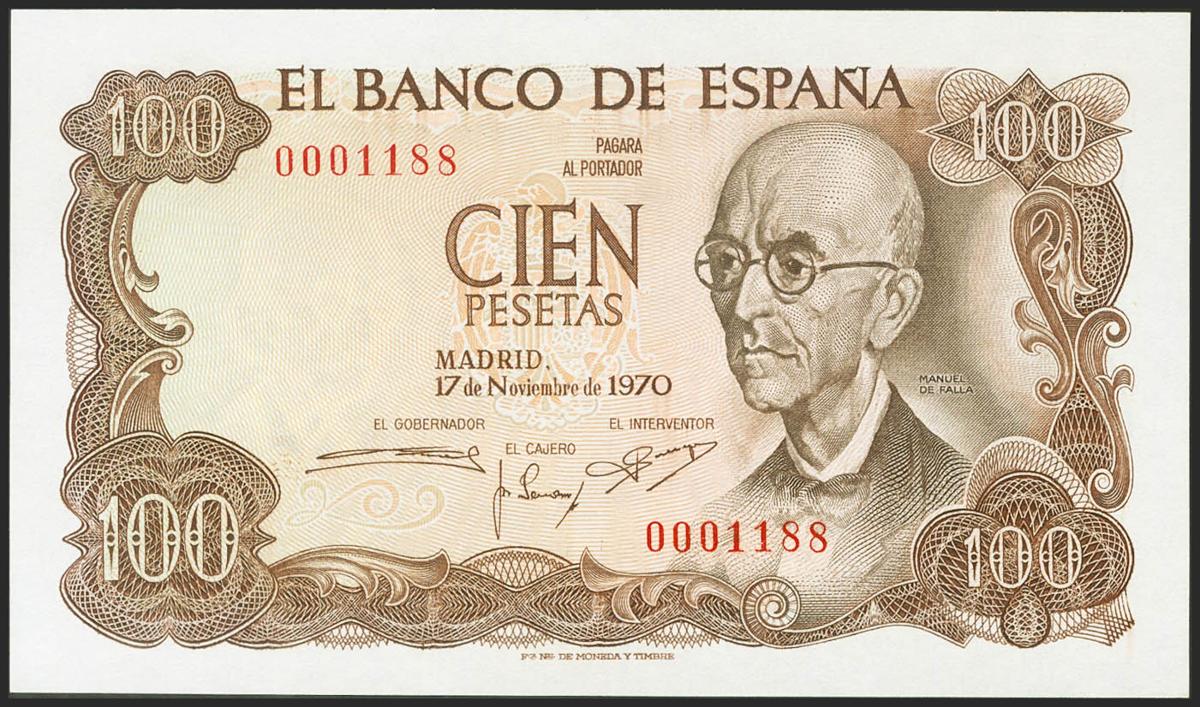 100 Pesetas. 17 de Noviembre de 1970. Sin serie y numeración bajísima. (Edifil 2021: 472). Apresto original. EBC+.