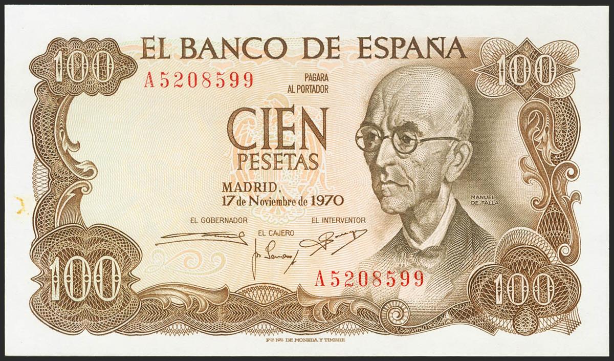 100 Pesetas. 17 de Noviembre de 1970. Serie A. (Edifil 2017: 472a). Apresto original y manchita. SC-.