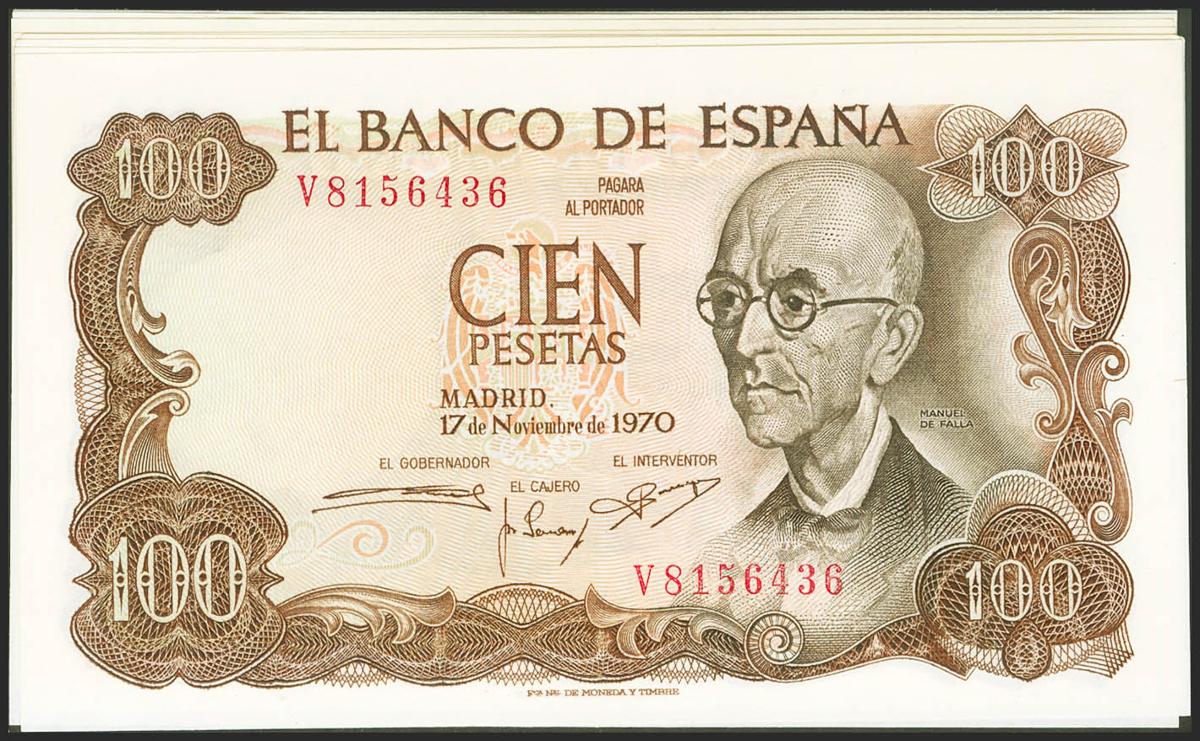 Conjunto de 4 parejas de billetes correlativos del 100 Pesetas emitidos el 17 de Noviembre de 1970 con las series V, 3J, 3L y 4H. (Edifil 2021: 472b/c). Apresto original. SC/SC-.