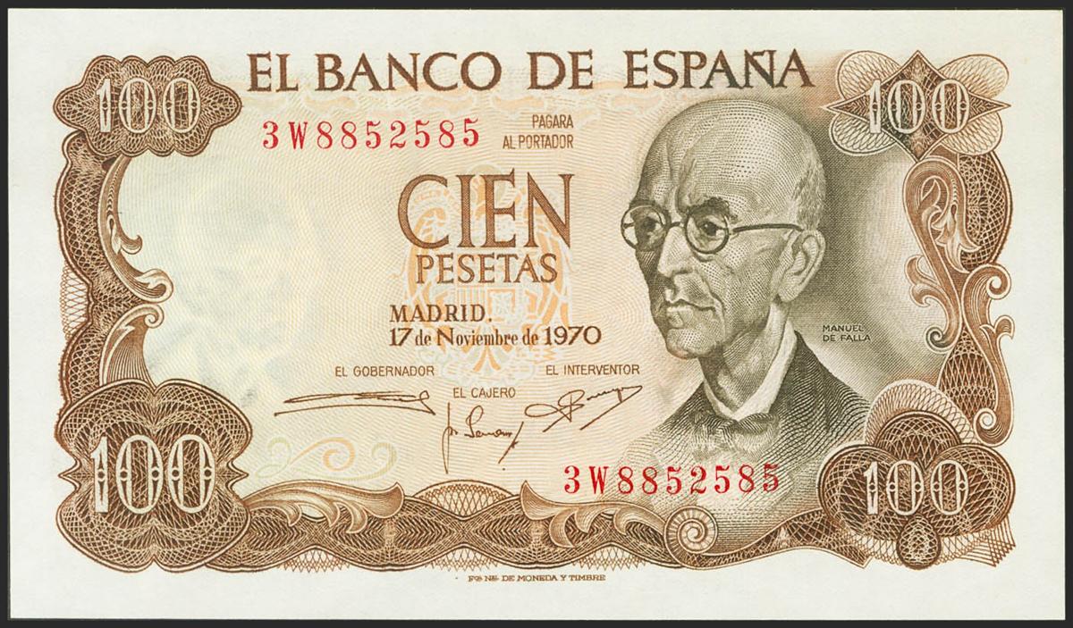 100 Pesetas. 17 de Noviembre de 1970. Serie 3W. (Edifil 2021: 472c). Conserva todo su apresto original. SC.