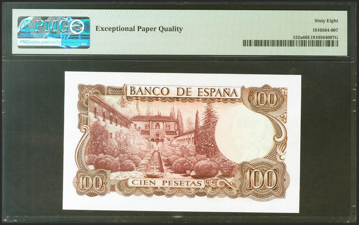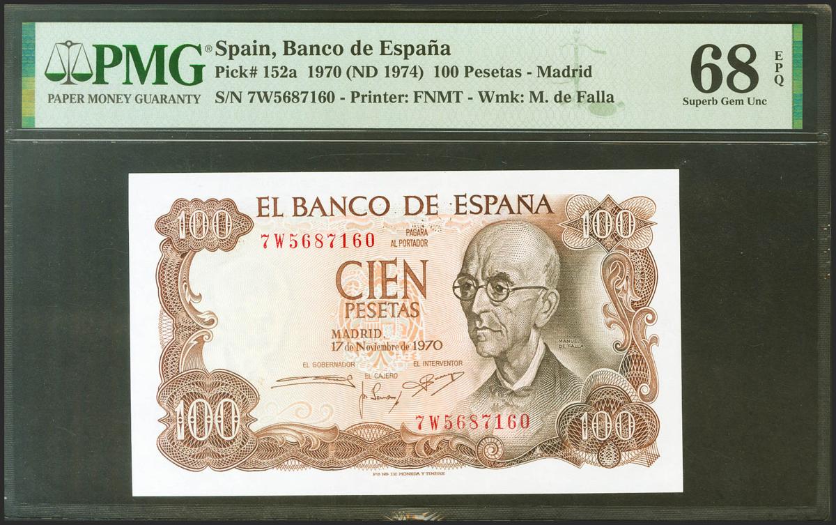 100 Pesetas. 17 de Noviembre de 1970. Serie 7W, última serie emitida. (Edifil 2021: 472c, Pick: 152a). Rarísimo en esta extraordinariamente rara excepcional calidad, apresto original. SC. Encapsulado PMG68EPQ.