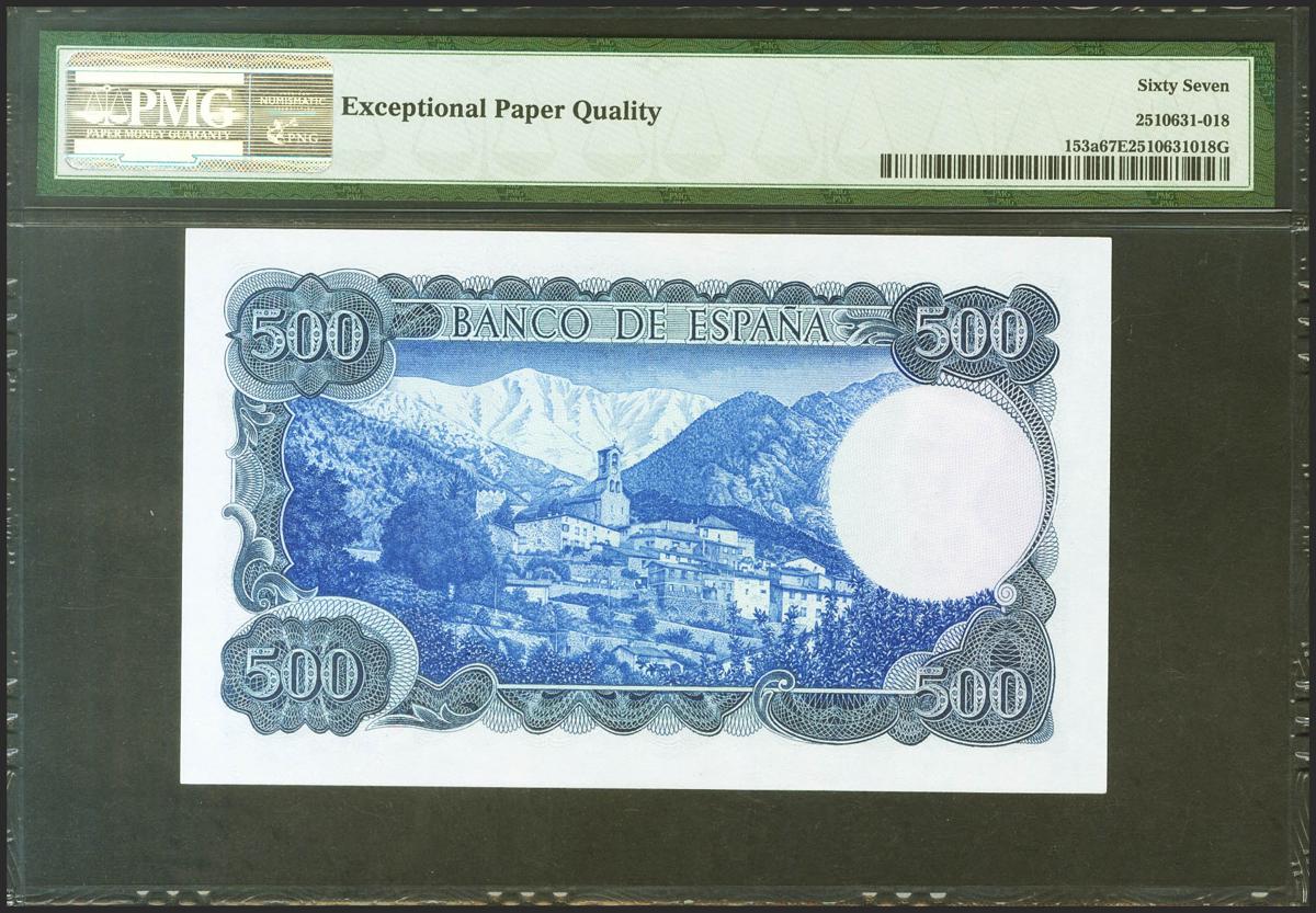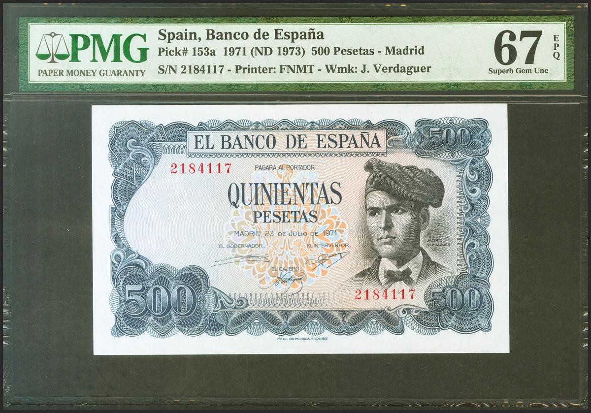500 Pesetas. 23 de Julio de 1971. Sin serie. (Edifil 2021: 473, Pick: 153a). Raro en esta excepcional calidad, apresto original. SC. Encapsulado PMG67EPQ.