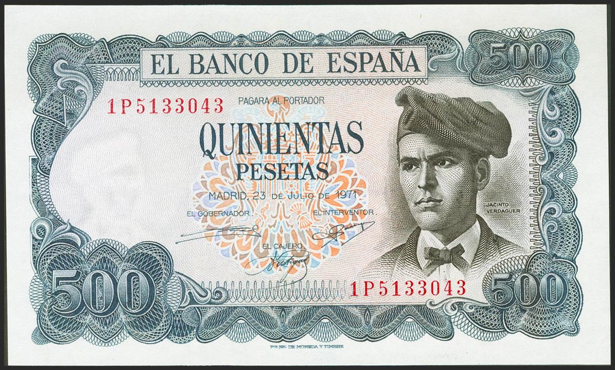 500 Pesetas. 23 de Julio de 1971. Serie 1P. (Edifil 2021: 473a). Apresto original. SC.