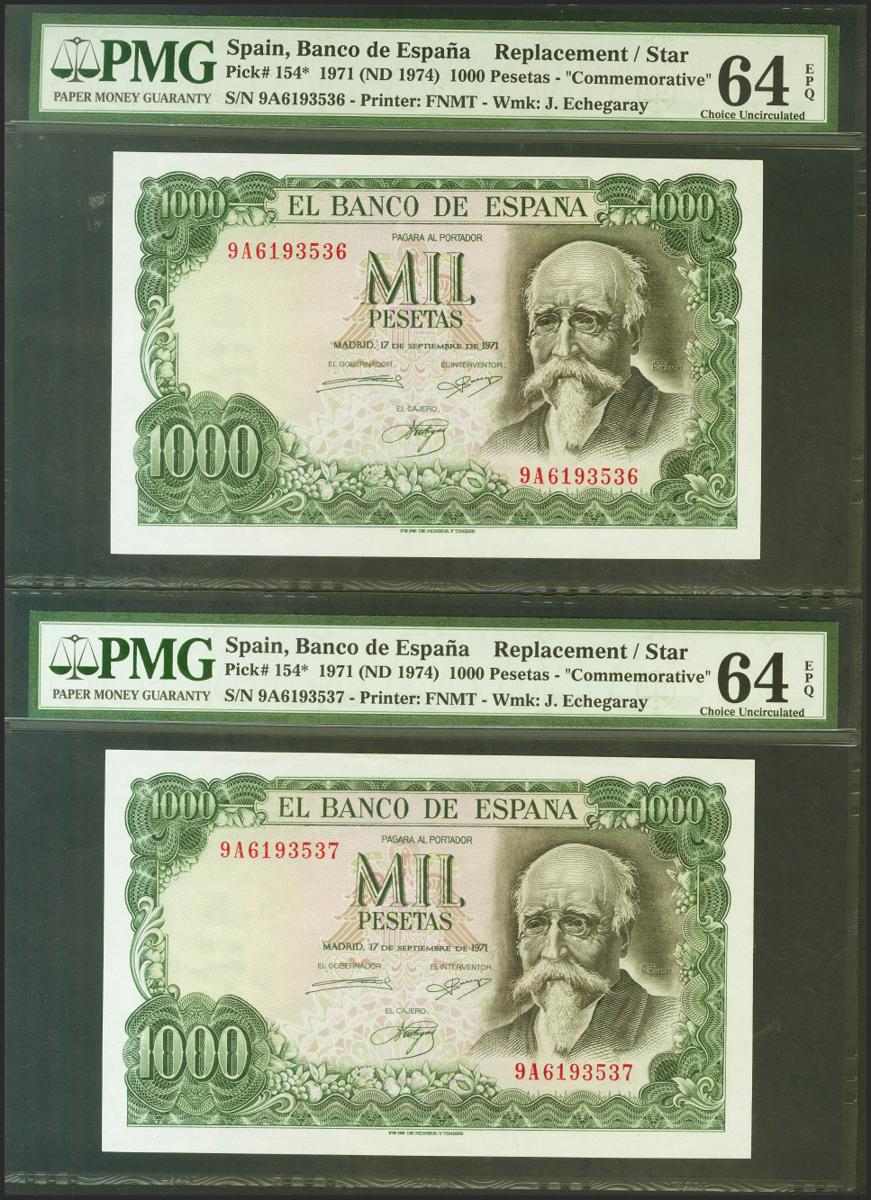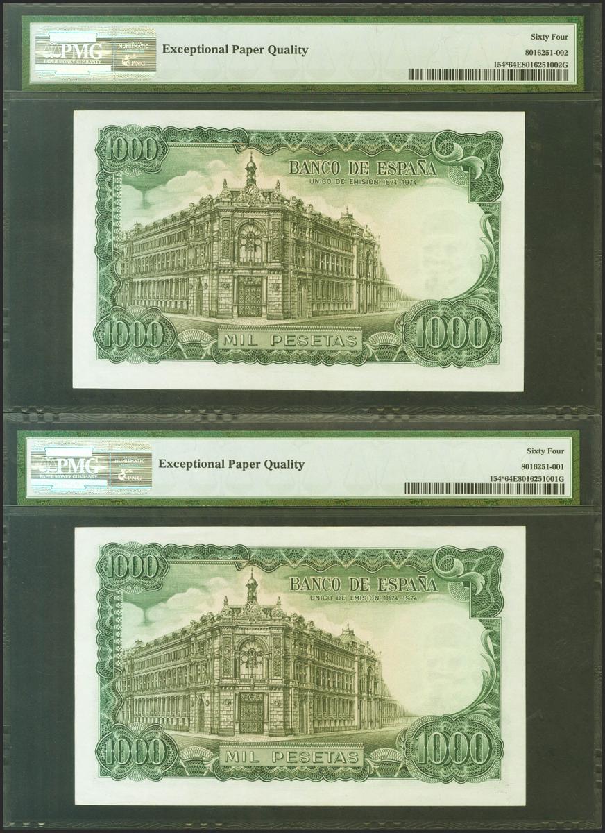 1000 Pesetas. 17 de Septiembre de 1971. Pareja correlativa. Serie especial 9A. (Edifil 2021: 474d, Pick: 154*). Apresto original. SC. Encapsulados PMG64EPQ, ambos.