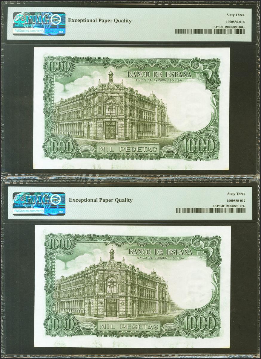 1000 Pesetas. 17 de Septiembre de 1971. Pareja correlativa. Serie especial 9C. (Edifil 2021: 474d, Pick: 154*). Inusual serie, más aun en pareja, apresto original. SC. Encapsulado PMG63EPQ, ambos.