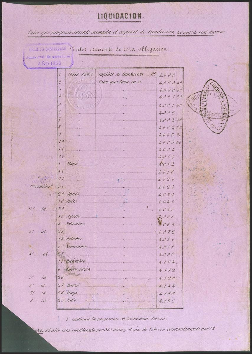 CREDITO CASTELLANO. 4024 Reales de Vellón. 21 de Febrero de 1862. Serie D y diversas marcas de uso interno del Banco de Valladolid. Rarísimo, especialmente en esta excepcional calidad. Para entender mejor la contextualización de este billete recomendamos la obra "Obligaciones, vales y documentos puestos en circulación como papel moneda en España", de Don Ramón Cobo Huici. EBC.