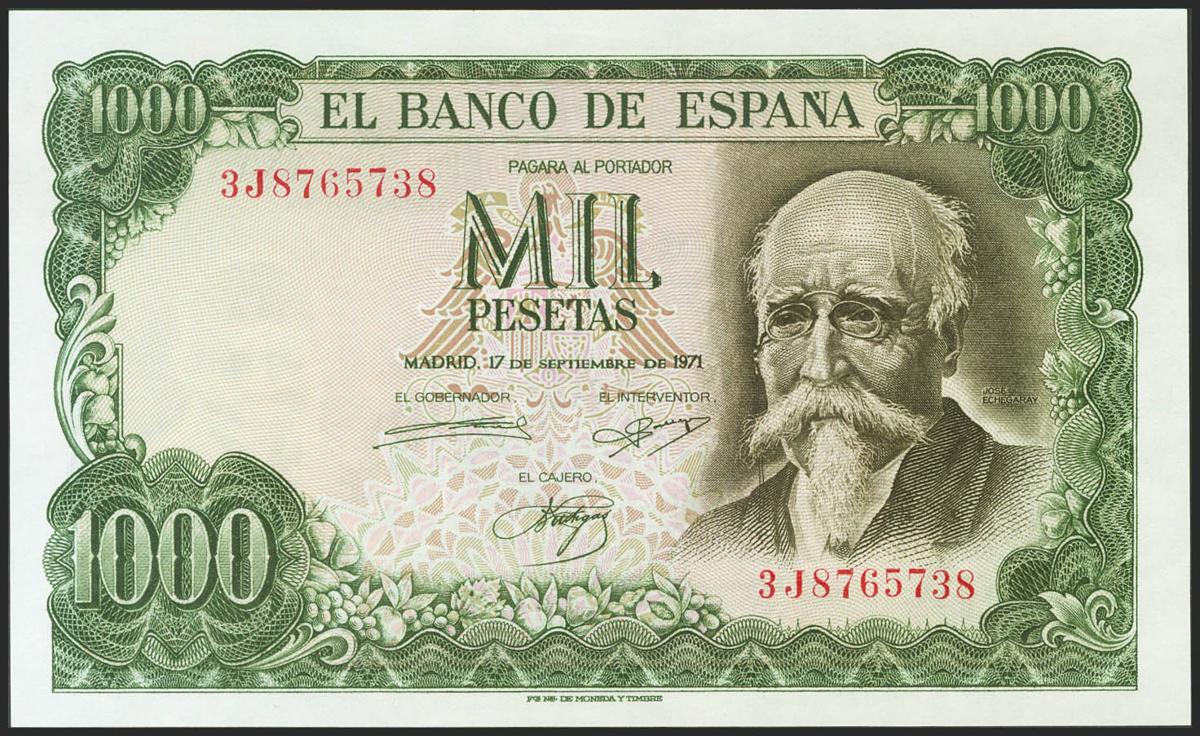 1000 Pesetas. 17 de Septiembre de 1971. Serie 3J. (Edifil 2021: 474c). Conservando todo su apresto original. SC.
