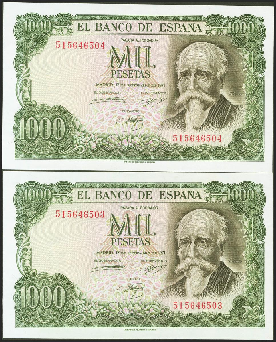 1000 Pesetas. 17 de Septiembre de 1971. Pareja correlativa. Serie 5I. (Edifil 2021: 474c). Conserva todo su apresto original. SC.