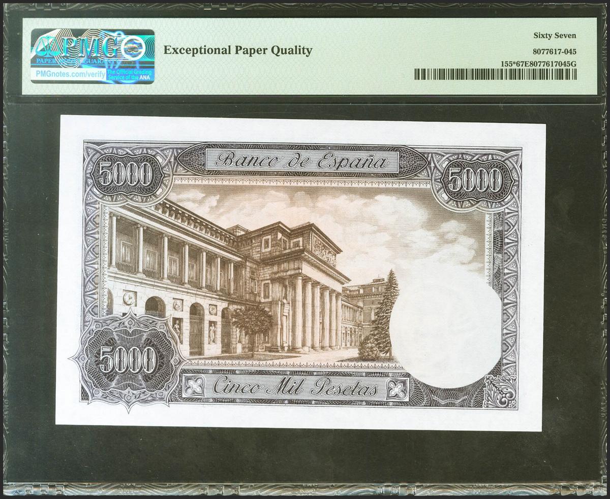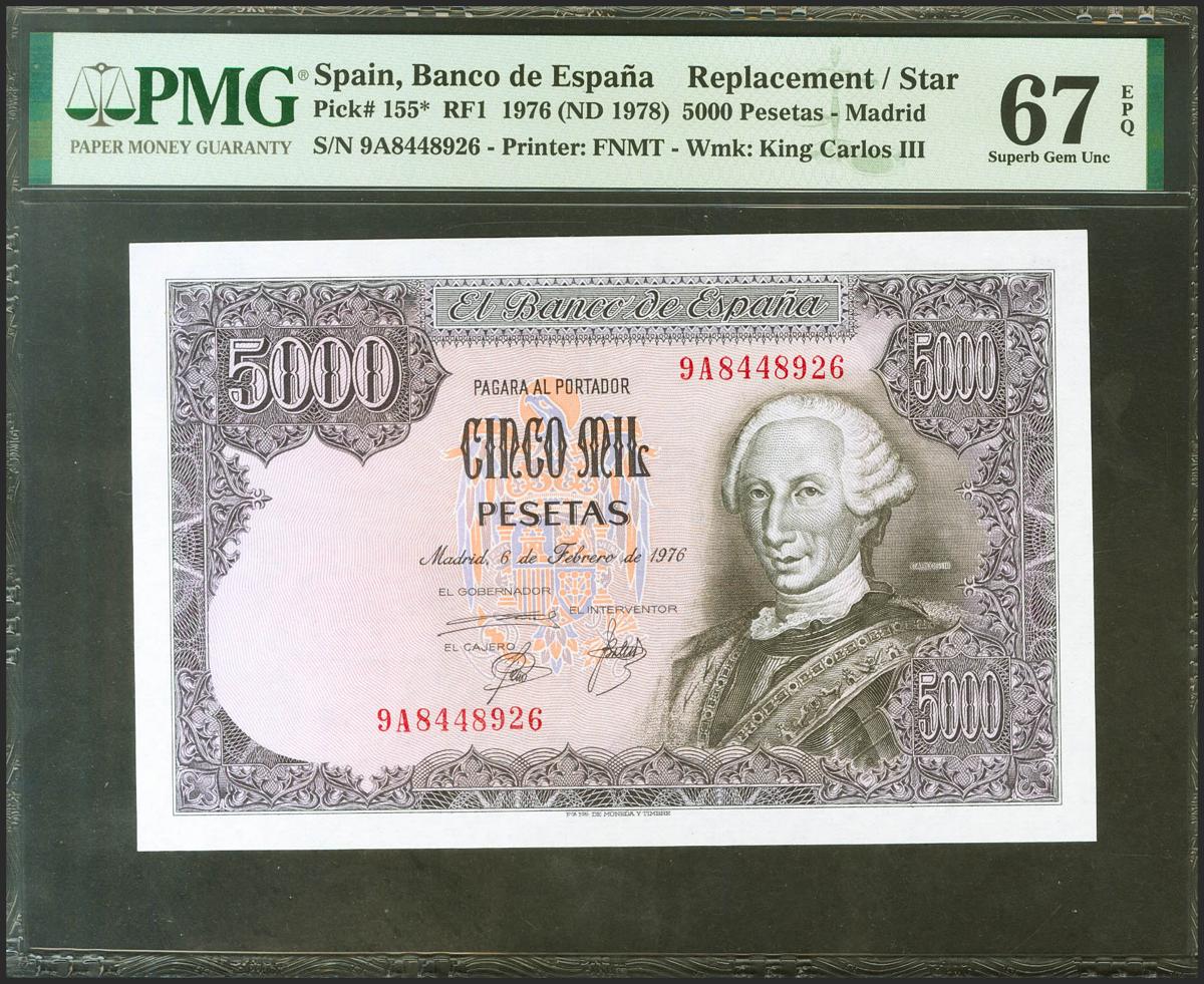 5000 Pesetas. 6 de Febrero de 1976. Serie especial 9A. (Edifil 2021: 475b, Pick: 155*). Rarísimo en esta excepcional calidad, apresto original. SC. Encapsulado PMG67EPQ.