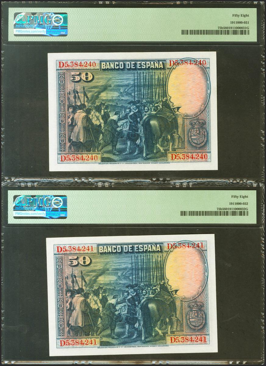 50 Pesetas. 15 de Agosto de 1928. Pareja correlativa. Serie D. (Edifil 2021: 354). Apresto original. EBC. Encapulados PMG58, ambos.