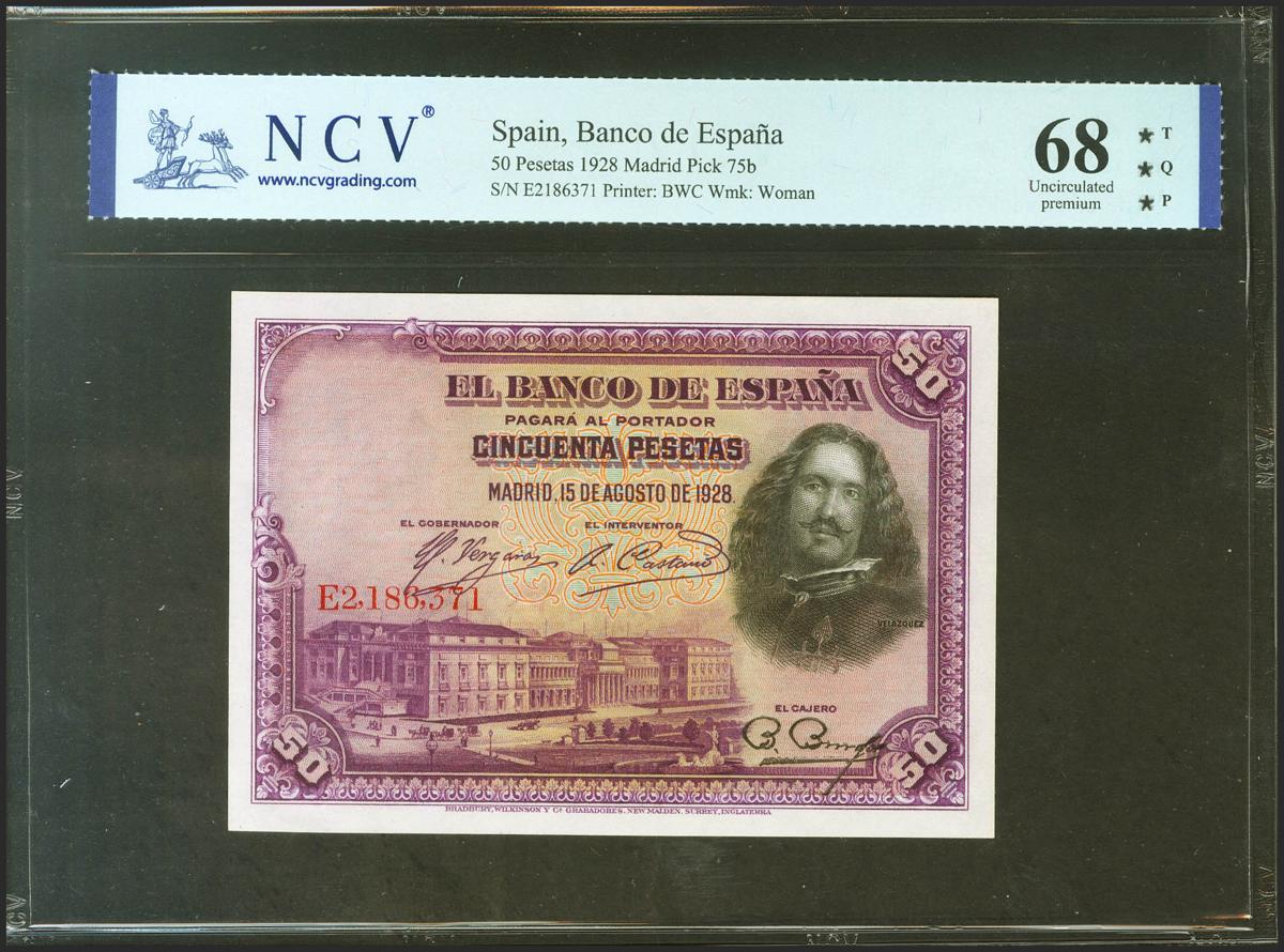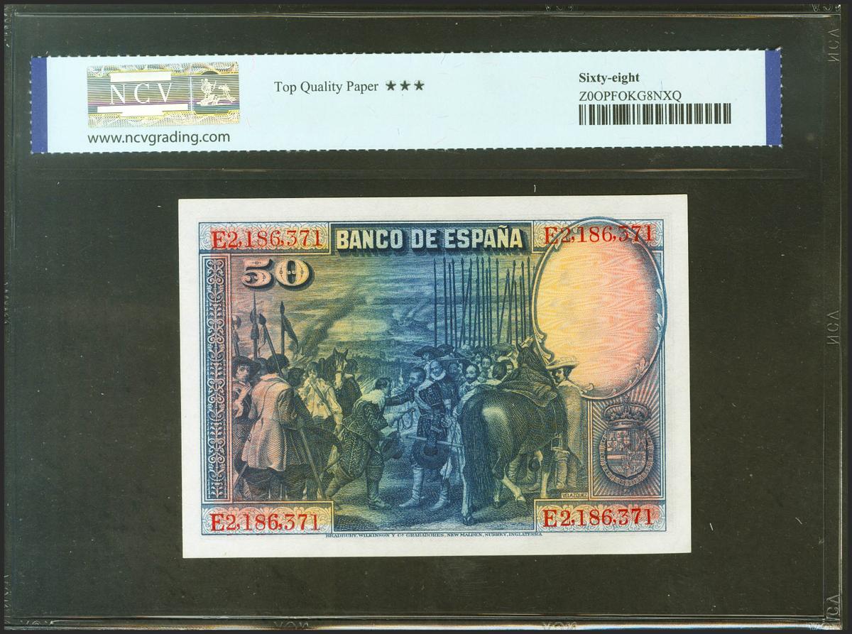 50 Pesetas. 15 de Agosto de 1928. Serie E, última serie emitida. (Edifil 2021: 354, Pick: 75b). Raro en esta excepcional calidad, apresto original. SC. Encapsulado NCV68TQP.