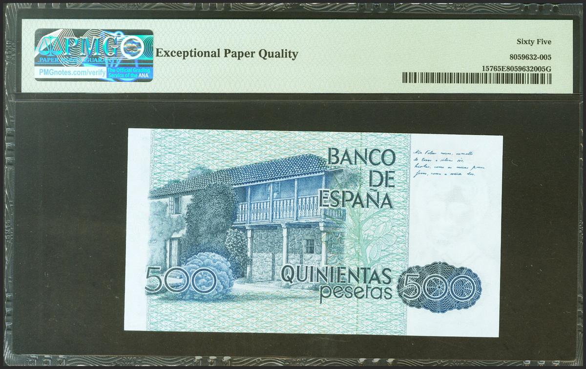 500 Pesetas. 23 de Octubre de 1979. Sin serie y numeración baja. (Edifil 2021: 476, Pick: 157). Apresto original. SC. Encapsulado PMG65EPQ