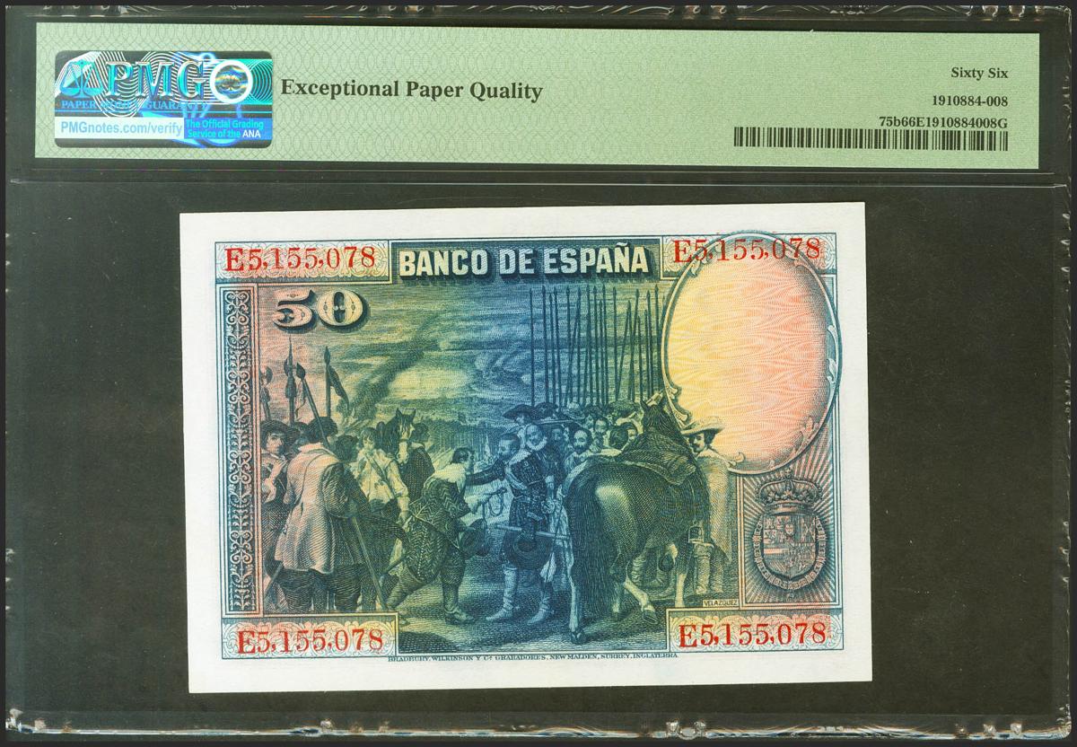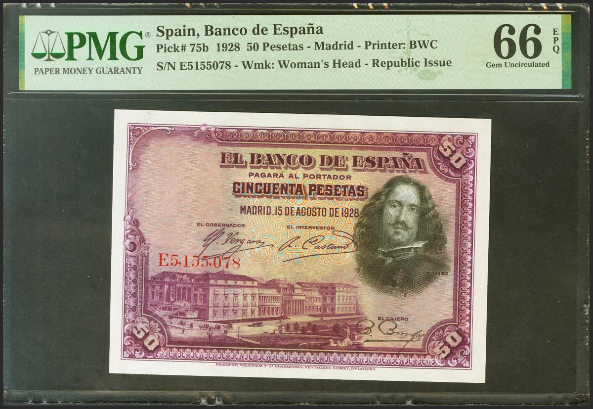 50 Pesetas. 15 de Agosto de 1928. Serie E, última serie emitida. (Edifil 2021: 354, Pick: 75b). Inusual en esta excepcional calidad, apresto original. SC. Encapsulado PMG66EPQ.