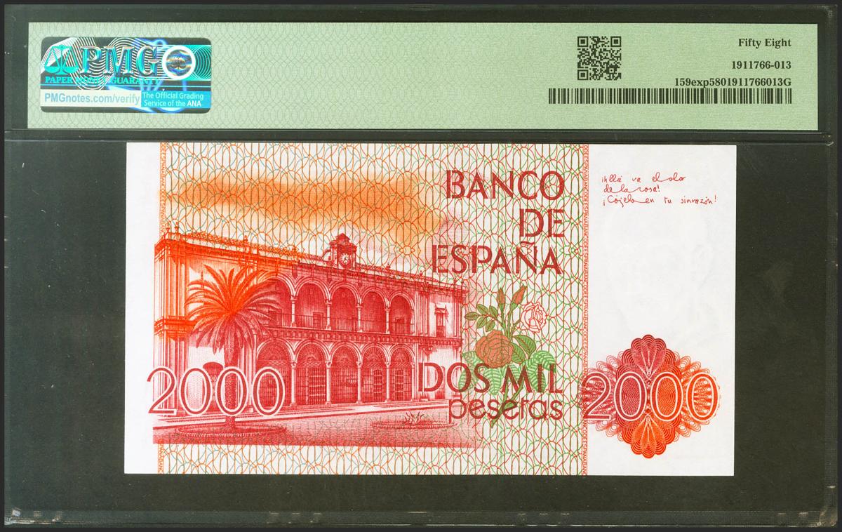 2000 Pesetas. 22 de Julio de 1980. Serie especial 8C. (Edifil 2021: 479c, Pick: 159exp). Extraordinariamente rara serie, para hacernos una idea de su rareza con la información estadística que disponemos nos atrevemos a afirmar que se trata, al menos, de una rareza tan importante como la serie 9B de Rosalía de Castro. EBC++. Encapsulado PMG58.