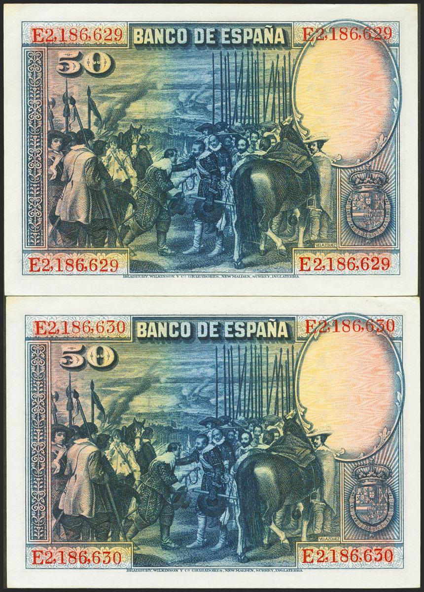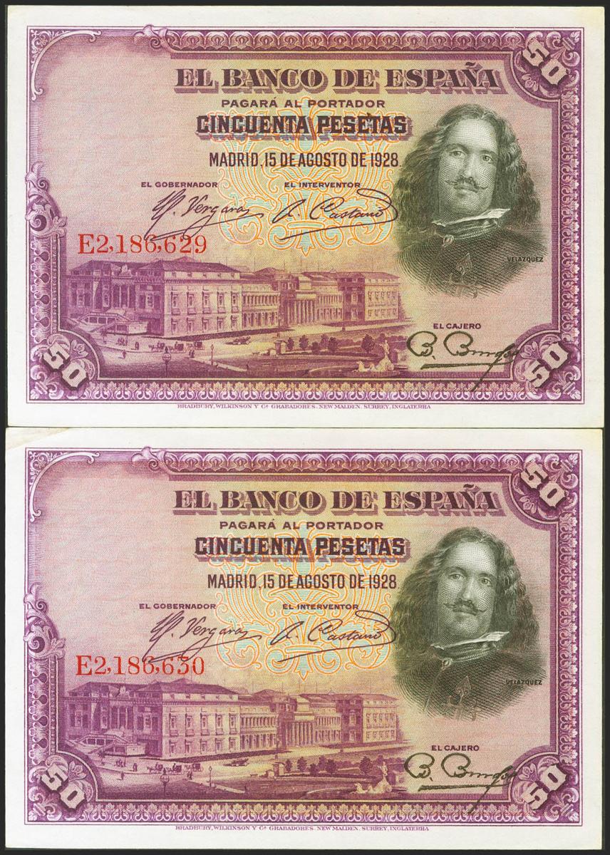 50 Pesetas. 15 de Agosto de 1928. Pareja correlativa. Inusual serie E. (Edifil 2021: 354). Apresto original. EBC++/SC-.