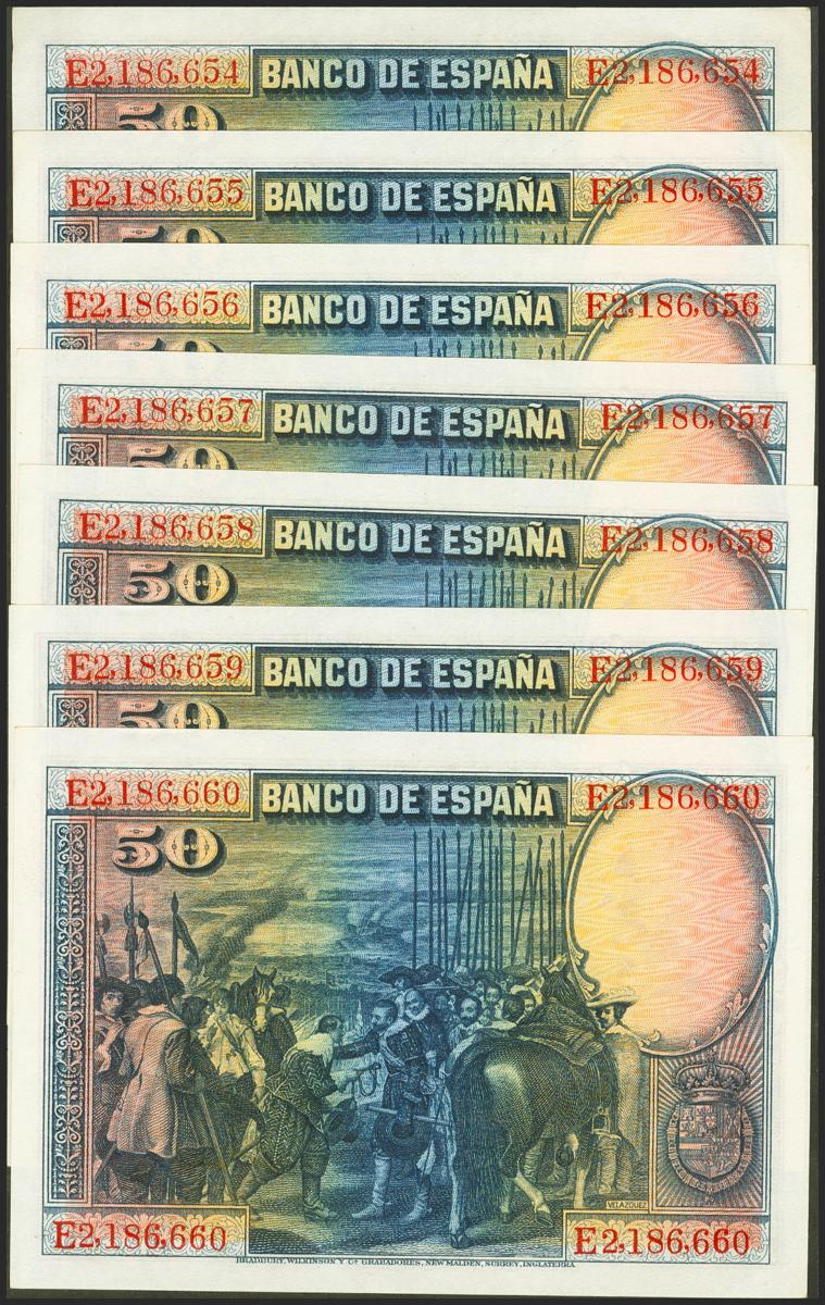 Conjunto de 7 billetes en tramos correlativos de 50 Pesetas emitidos el 15 de Agosto de 1928, con la serie E (Edifil 2021: 354), conservan gran parte de su apresto original. SC/EBC++.