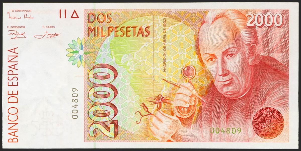 2000 Pesetas. 24 de Abril de 1992. Sin serie y numeración bajísima. (Edifil 2021: 482). SC.