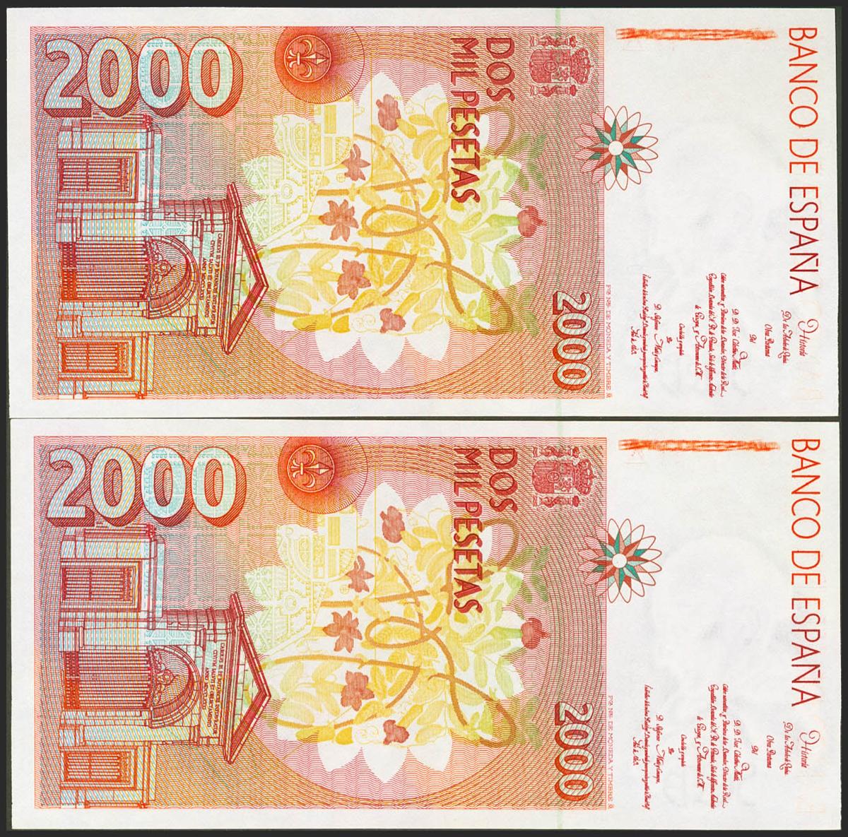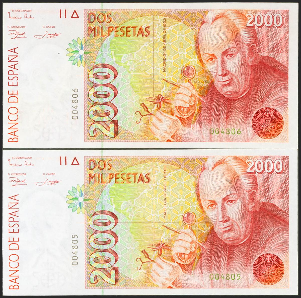 2000 Pesetas. 24 de Abril de 1992. Pareja correlativa. Sin serie y numeración bajísima. (Edifil 2021: 482). SC.